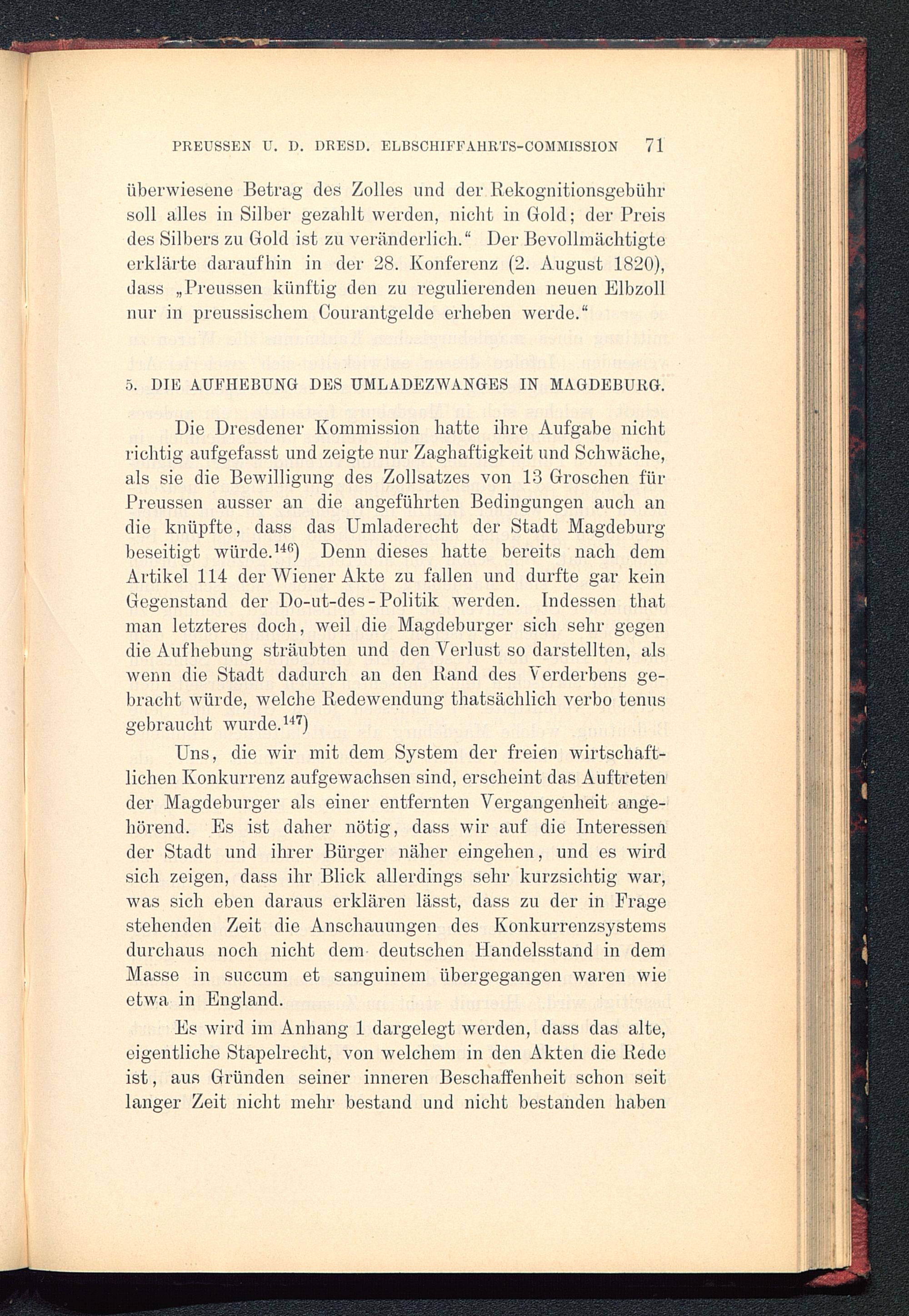 Die Dresdener Kommission hatte ihre Aufgabe nichtrichtig aufgefasst und zeigte nur Zaghaftigkeit und Schwäche,als sie die Bewilligung des Zollsatzes von 13 Groschen fürPreussen ausser an die angeführten Bedingungen auch andie knüpfte, dass das Umladerecht der Stadt Magdeburg beseitigt würde. 14 * 5 ) Denn dieses hatte bereits nach demArtikel 114 der Wiener Akte zu fallen und durfte gar keinGegenstand der Do-ut-des- Politik werden. Indessen thatman letzteres doch, weil die Magdeburger sich sehr gegendie Aufhebung sträubten und den Verlust so darstellten, alswenn die Stadt dadurch an den Rand des Verderbens ge-bracht würde, welche Redewendung thatsächlich verbo tenusgebraucht wurde. 147 )