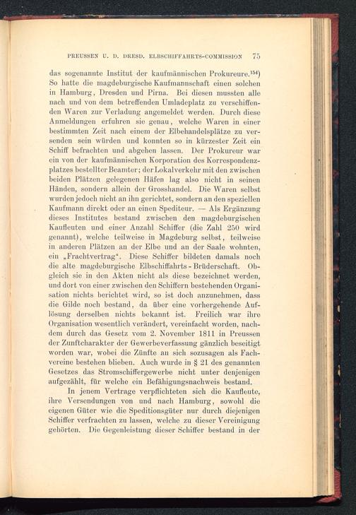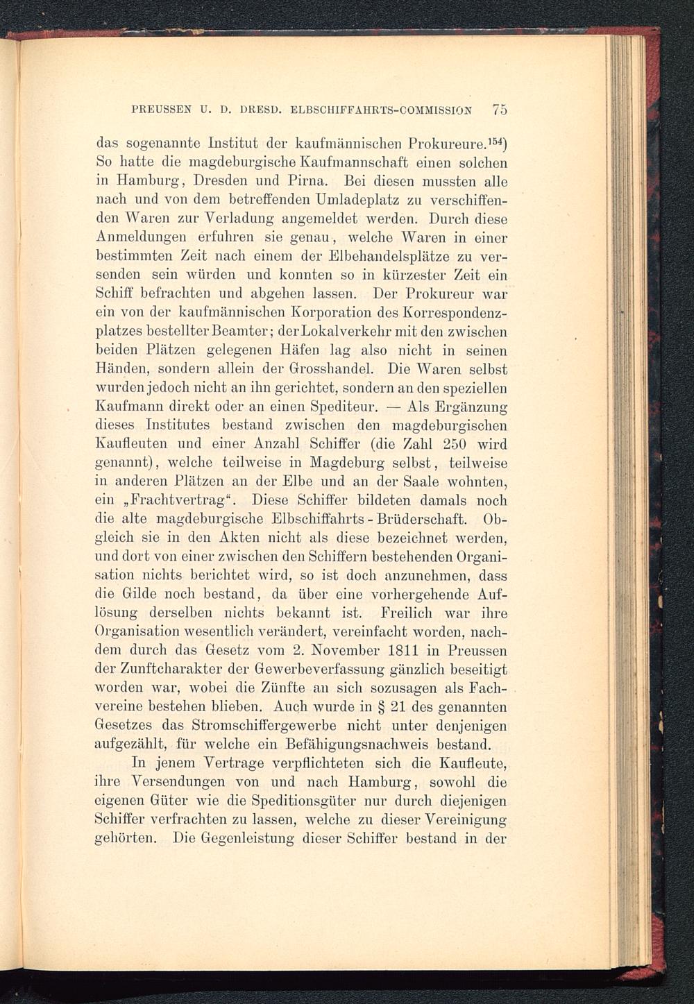 das sogenannte Institut der kaufmännischen Prokureure. 154 )So hatte die magdeburgische Kaufmannschaft einen solchenin Hamburg, Dresden und Pirna . Bei diesen mussten allenach und von dem betreffenden Umladeplatz zu verschiffen-den Waren zur Verladung angemeldet werden. Durch dieseAnmeldungen erfuhren sie genau, welche Waren in einerbestimmten Zeit nach einem der Elbehandelsplätze zu ver-senden sein würden und konnten so in kürzester Zeit einSchiff befrachten und abgehen lassen. Der Prokureur warein von der kaufmännischen Korporation des Korrespondenz-platzes bestellter Beamter; der Lokalverkehr mit den zwischenbeiden Plätzen gelegenen Häfen lag also nicht in seinenHänden, sondern allein der Grosshandel. Die Waren selbstwurden jedoch nicht an ihn gerichtet, sondern an den speziellenKaufmann direkt oder an einen Spediteur. — Als Ergänzungdieses Institutes bestand zwischen den magdeburgischenKaufleuten und einer Anzahl Schiffer (die Zahl 250 wirdgenannt), welche teilweise in Magdeburg selbst, teilweisein anderen Plätzen an der Elbe und an der Saale wohnten,ein „Frachtvertrag “. Diese Schiffer bildeten damals nochdie alte magdeburgische Elbschiffahrts - Brüderschaft. Ob-gleich sie in den Akten nicht als diese bezeichnet werden,und dort von einer zwischen den Schiffern bestehenden Organi-sation nichts berichtet wird, so ist doch anzunehmen, dassdie Gilde noch bestand, da über eine vorhergehende Auf-lösung derselben nichts bekannt ist. Freilich war ihreOrganisation wesentlich verändert, vereinfacht worden, nach-dem durch das Gesetz vom 2. November 1811 in Preussen der Zunftcharakter der Gewerbeverfassung gänzlich beseitigtworden war, wobei die Zünfte an sich sozusagen als Fach-vereine bestehen blieben. Auch wurde in § 21 des genanntenGesetzes das Stromschiffergewerbe nicht unter denjenigenaufgezählt, für welche ein Befähigungsnachweis bestand.