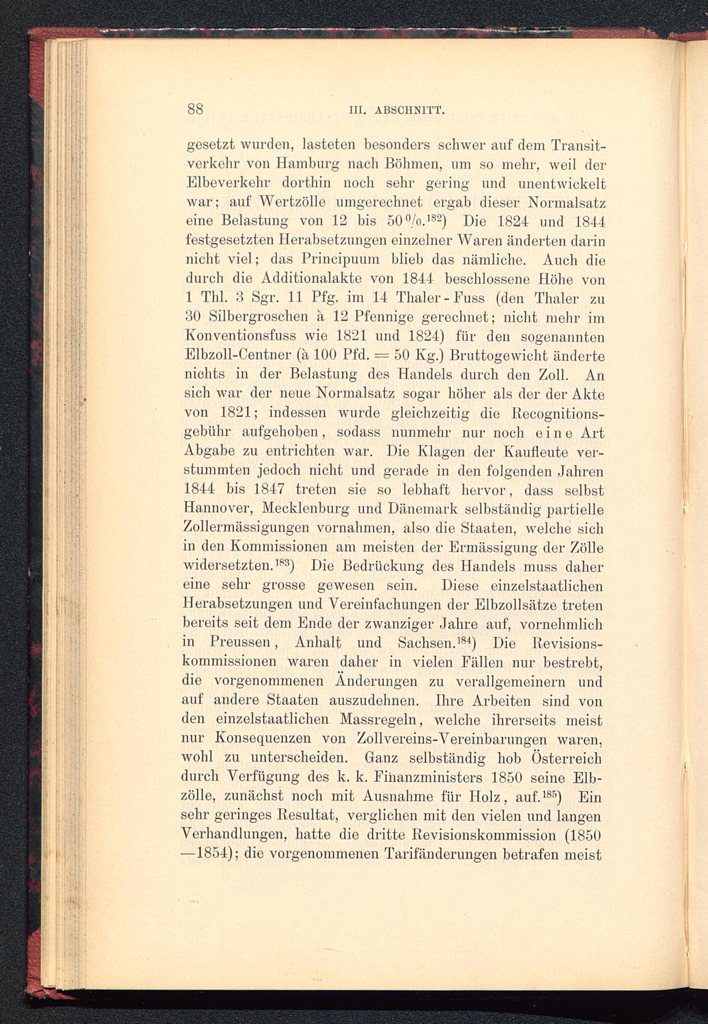 gesetzt wurden, lasteten besonders schwer auf dem Transit-verkehr von Hamburg nach Böhmen , um so mein-, weil derElbeverkehr dorthin noch sehr gering und unentwickeltwar; auf Wertzölle umgerechnet ergab dieser Normalsatzeine Belastung von 12 bis 50 0 /o. 182 ) Die 1824 und 1844festgesetzten Herabsetzungen einzelner Waren änderten darinnicht viel; das Principuum blieb das nämliche. Auch diedurch die Additionalakte von 1844 beschlossene Höhe von1 Thl. 3 Sgr. 11 Pfg. im 14 Thaler-Fuss (den Thaler zu30 Silbergroschen ä 12 Pfennige gerechnet; nicht mehr imIvonventionsfuss wie 1821 und 1824) für den sogenanntenElbzoll-Centner (ä 100 Pfd. — 50 Kg.) Bruttogewicht ändertenichts in der Belastung des Handels durch den Zoll. Ansich war der neue Normalsatz sogar höher als der der Aktevon 1821; indessen wurde gleichzeitig die Recognitions-gebühr aufgehoben, sodass nunmehr nur noch eine ArtAbgabe zu entrichten war. Die Klagen der Kaufleute ver-stummten jedoch nicht und gerade in den folgenden Jahren1844 bis 1847 treten sie so lebhaft hervor, dass selbstHannover, Mecklenburg und Dänemark selbständig partielleZollermässigungen Vornahmen, also die Staaten, welche sichin den Kommissionen am meisten der Ermässigung der Zöllewidersetzten. 1 - 3 ) Die Bedrückung des Handels muss dahereine sehr grosse gewesen sein. Diese einzelstaatlichenHerabsetzungen und Vereinfachungen der Elbzollsätze tretenbereits seit dem Ende der zwanziger Jahre auf, vornehmlichin Preussen, Anhalt und Sachsen. 184 ) Die Revisions-kommissionen waren daher in vielen Fällen nur bestrebt,die vorgenommenen Änderungen zu verallgemeinern undauf andere Staaten auszudehnen. Ihre Arbeiten sind vonden einzelstaatlichen Massregeln, welche ihrerseits meistnur Konsequenzen von Zoll Vereins-Vereinbarungen waren,wohl zu unterscheiden. Ganz selbständig hob Österreich durch Verfügung des k. k. Finanzministers 1850 seine Elb-zölle, zunächst noch mit Ausnahme für Holz, auf'. 185 ) Einsehr geringes Resultat, verglichen mit den vielen und langenVerhandlungen, hatte die dritte Revisionskommission (1850—1854); die vorgenommenen Tarifänderungen betrafen meist