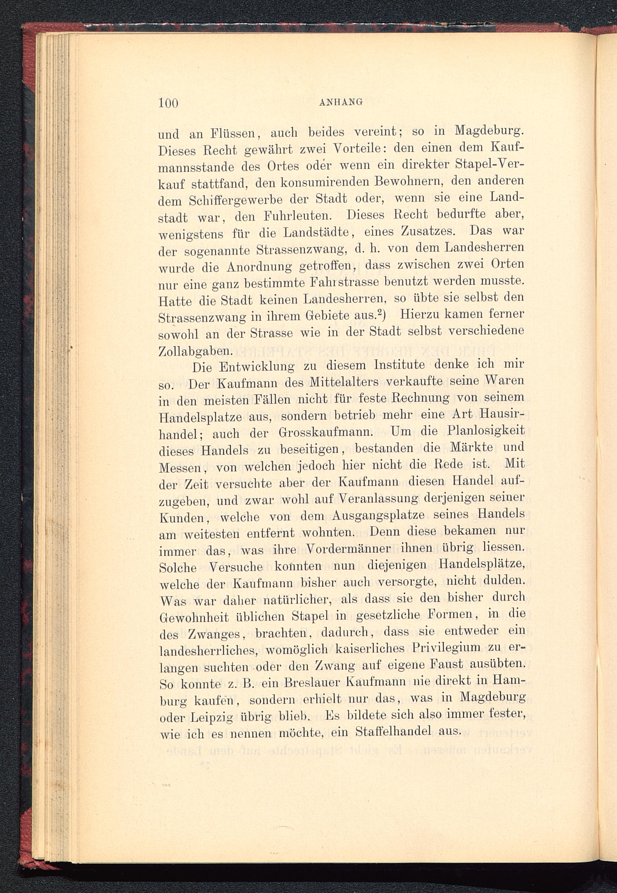 und an Flüssen, auch beides vereint; so in Magdeburg .Dieses Recht gewährt zwei Vorteile: den einen dem Kauf-mannsstande des Ortes oder wenn ein direkter Stapel-Ver-kauf stattfand, den konsumirenden Bewohnern, den anderendem Schiffergewerbe der Stadt oder, wenn sie eine Land-stadt war, den Fuhrleuten. Dieses Recht bedurfte aber,wenigstens für die Landstädte, eines Zusatzes. Das warder sogenannte Strassenzwang, d. h. von dem Landesherrenwurde die Anordnung getroffen, dass zwischen zwei Ortennur eine ganz bestimmte Fahl strasse benutzt werden musste.Hatte die Stadt keinen Landesherren, so übte sie selbst denStrassenzwang in ihrem Gebiete aus. 2 ) Hierzu kamen fernersowohl an der Strasse wie in der Stadt selbst verschiedeneZollabgaben.