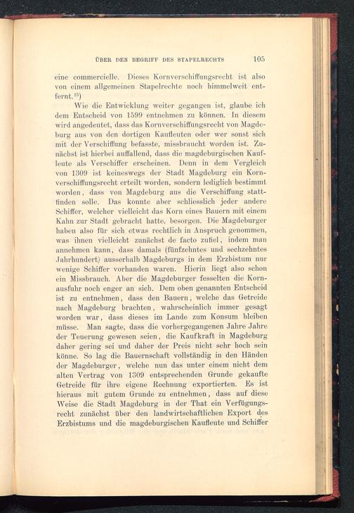 Wie die Entwicklung weiter gegangen ist, glaube ichdem Entscheid von 1599 entnehmen zu können. In diesemwird angedeutet, dass das Kornverschiffungsrecht von Magde-burg aus von den dortigen Kaufleuten oder wer sonst sichmit der Verschiffung befasste, missbraucht worden ist. Zu-nächst ist hierbei auffallend, dass die magdeburgischen Kauf-leute als Verschiffer erscheinen. Denn in dem Vergleichvon 1309 ist keineswegs der Stadt Magdeburg ein Korn-verschiffungsrecht erteilt worden, sondern lediglich bestimmtworden, dass von Magdeburg aus die Verschiffung statt-finden solle. Das konnte aber schliesslich jeder andereSchiffer, welcher vielleicht das Korn eines Bauern mit einemKahn zur Stadt gebracht hatte, besorgen. Die Magdeburger haben also für sich etwas rechtlich in Anspruch genommen,was ihnen vielleicht zunächst de facto zufiel, indem manannehmen kann, dass damals (fünfzehntes und sechzehntesJahrhundert) ausserhalb Magdeburgs in dem Erzbistum nurwenige Schiffer vorhanden waren. Hierin liegt also schonein Missbrauch. Aber die Magdeburger fesselten die Korn-ausführ noch enger an sich. Dem oben genannten Entscheidist zu entnehmen, dass den Bauern, welche das Getreidenach Magdeburg brachten, wahrscheinlich immer gesagtworden war, dass dieses im Lande zum Konsum bleibenmüsse. Man sagte, dass die vorhergegangenen Jahre Jahreder Teuerung gewesen seien, die Kaufkraft in Magdeburg daher gering sei und daher der Preis nicht sehr hoch seinkönne. So lag die Bauernschaft vollständig in den Händender Magdeburger , welche nun das unter einem nicht demalten Vertrag von 1309 entsprechenden Grunde gekaufteGetreide für ihre eigene Rechnung exportierten. Es isthieraus mit gutem Grunde zu entnehmen, dass auf dieseAVeise die Stadt Magdeburg in der That ein Verfügungs-recht zunächst über den landwirtschaftlichen Export desErzbistums und die magdeburgischen Kaufleute und Schiffer