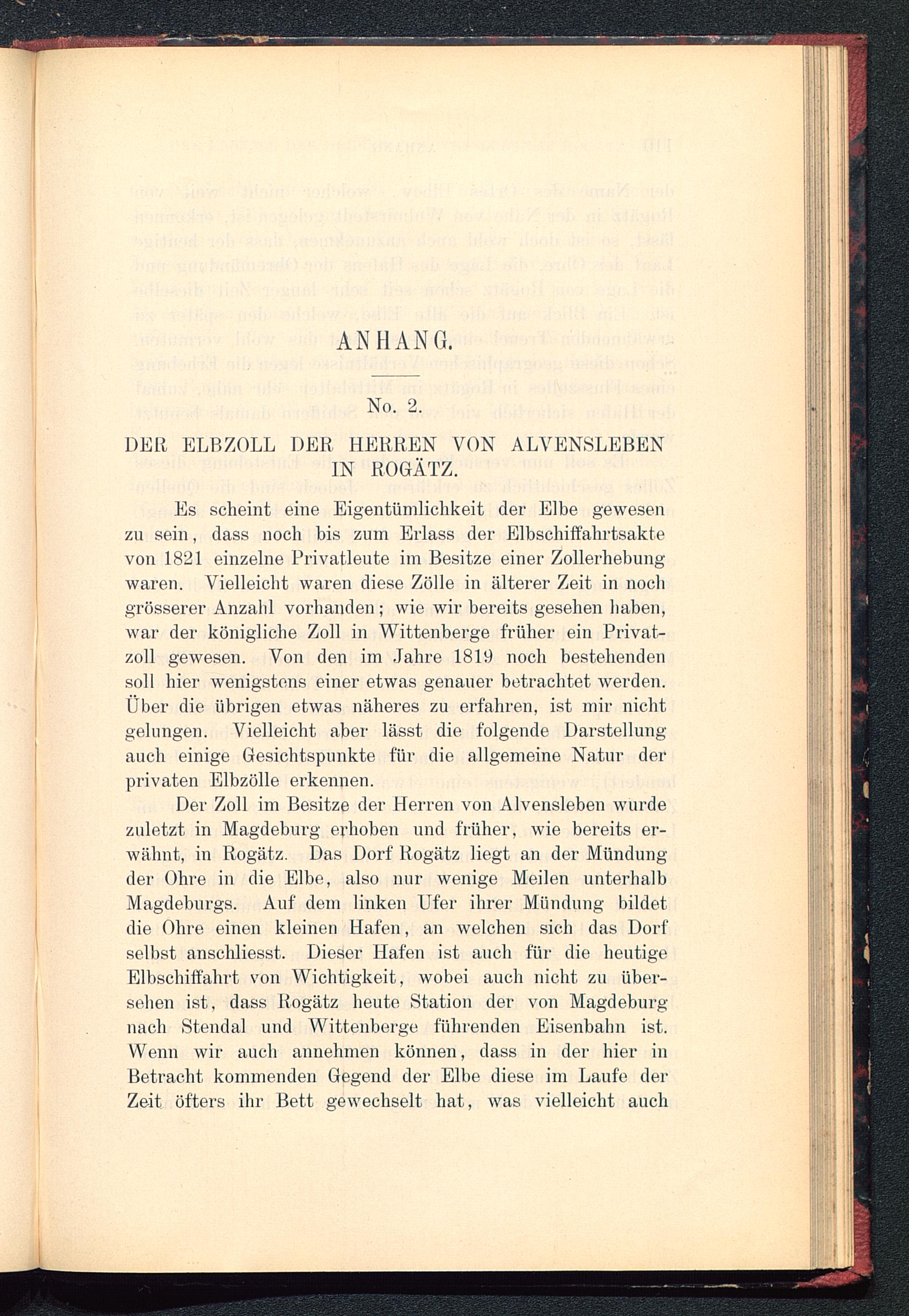 Der Zoll im Besitze der Herren von Al vensleben wurdezuletzt in Magdeburg erhoben und früher, wie bereits er-wähnt, in Rogätz. Das Dorf Rogätz liegt an der Mündungder Ohre in die Elbe, also nur wenige Meilen unterhalbMagdeburgs . Auf dem linken Ufer ihrer Mündung bildetdie Ohre einen kleinen Hafen, an welchen sich das Dorfselbst anschliesst. Dieser Hafen ist auch für die heutigeElbschiffahrt von Wichtigkeit, wobei auch nicht zu über-sehen ist, dass Rogätz heute Station der von Magdeburg nach Stendal und Wittenberge führenden Eisenbahn ist.Wenn wir auch annehmen können, dass in der hier inBetracht kommenden Gegend der Elbe diese im Laufe derZeit öfters ihr Bett gewechselt hat, was vielleicht auch