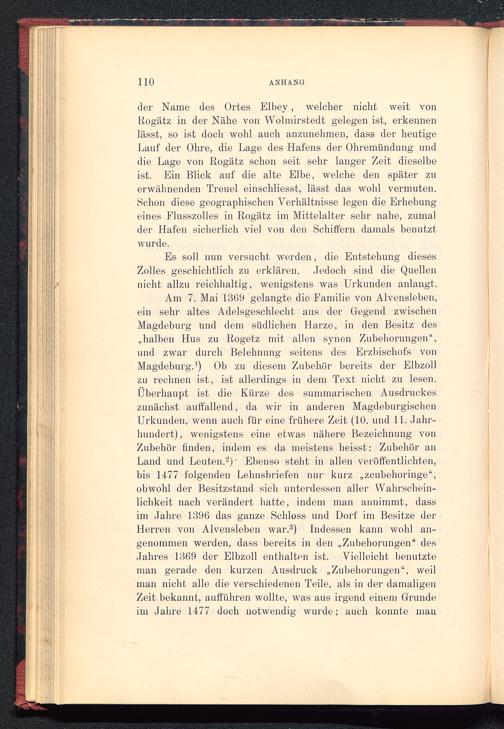 Am 7. Mai 1869 gelangte die Familie von Alvensleben,ein sehr altes Adelsgeschlecht aus der Gegend zwischenMagdeburg und dem südlichen Harze, in den Besitz des„halben Hus zu Iiogetz mit allen synen Zubehorungen“,und zwar durch Belehnung seitens des Erzbischofs vonMagdeburg . 1 ) Ob zu diesem Zubehör bereits der Elbzollzu rechnen ist, ist allerdings in dem Text nicht zu lesen.Überhaupt ist die Kürze des summarischen Ausdruckeszunächst auffallend, da wir in anderen MagdeburgischenUrkunden, wenn auch für eine frühere Zeit (10. und 11. Jahr-hundert) , wenigstens eine etwas nähere Bezeichnung vonZubehör finden, indem es da meistens heisst: Zubehör anLand und Leuten. 2 ) - Ebenso steht in allen veröffentlichten,bis 1477 folgenden Lehnsbriefen nur kurz „zcubehoringe“,obwohl der Besitzstand sich unterdessen aller Wahrschein-lichkeit nach verändert hatte, indem man annimmt, dassim Jahre 1396 das ganze Schloss und Dorf im Besitze derHerren von Alvensleben war. 3 ) Indessen kann wohl an-genommen werden, dass bereits in den „Zubehorungen“ desJahres 1369 der Elbzoll enthalten ist. Vielleicht benutzteman gerade den kurzen Ausdruck „Zubehorungen“, weilman nicht alle die verschiedenen Teile, als in der damaligenZeit bekannt, aufführen wollte, was aus irgend einem Grundeim Jahre 1477 doch notwendig wurde; auch konnte man