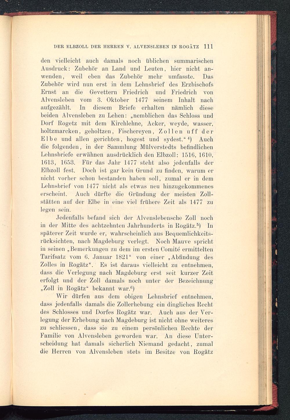 den vielleicht auch damals noch üblichen summarischenAusdruck: Zubehör an Land und Leuten, hier nicht an-wenden, weil eben das Zubehör mehr umfasste. DasZubehör wird nun erst in dem Lehnsbrief des ErzbischofsErnst an die Gevettern Friedrich und Friedrich vonAlvensleben vom 3. Oktober 14-77 seinem Inhalt nachaufgezählt. In diesem Briefe erhalten nämlich diesebeiden Alvensleben zu Lehen : „nemblichen das Schloss undDorf Rogetz mit dem Kirchlehne, Acker, weyde, wasser,holtzmarcken, geholtzen , Fischereyen, Zollen uff derElbe und allen gerichten, hogest und sydest.“ 4 ) Auchdie folgenden, in der Sammlung Mülverstedts befindlichenLehnsbriefe erwähnen ausdrücklich den Elbzoll: 1516,1610,1613, 1653. Für das Jahr 1477 steht also jedenfalls derElbzoll fest. Doch ist gar kein Grund zu finden, warum ernicht vorher schon bestanden haben soll, zumal er in demLelmsbrief von 1477 nicht als etwas neu hinzugekommeneserscheint. Auch dürfte die Gründung der meisten Zoll-stätten auf der Elbe in eine viel frühere Zeit als 1477 zulegen sein.