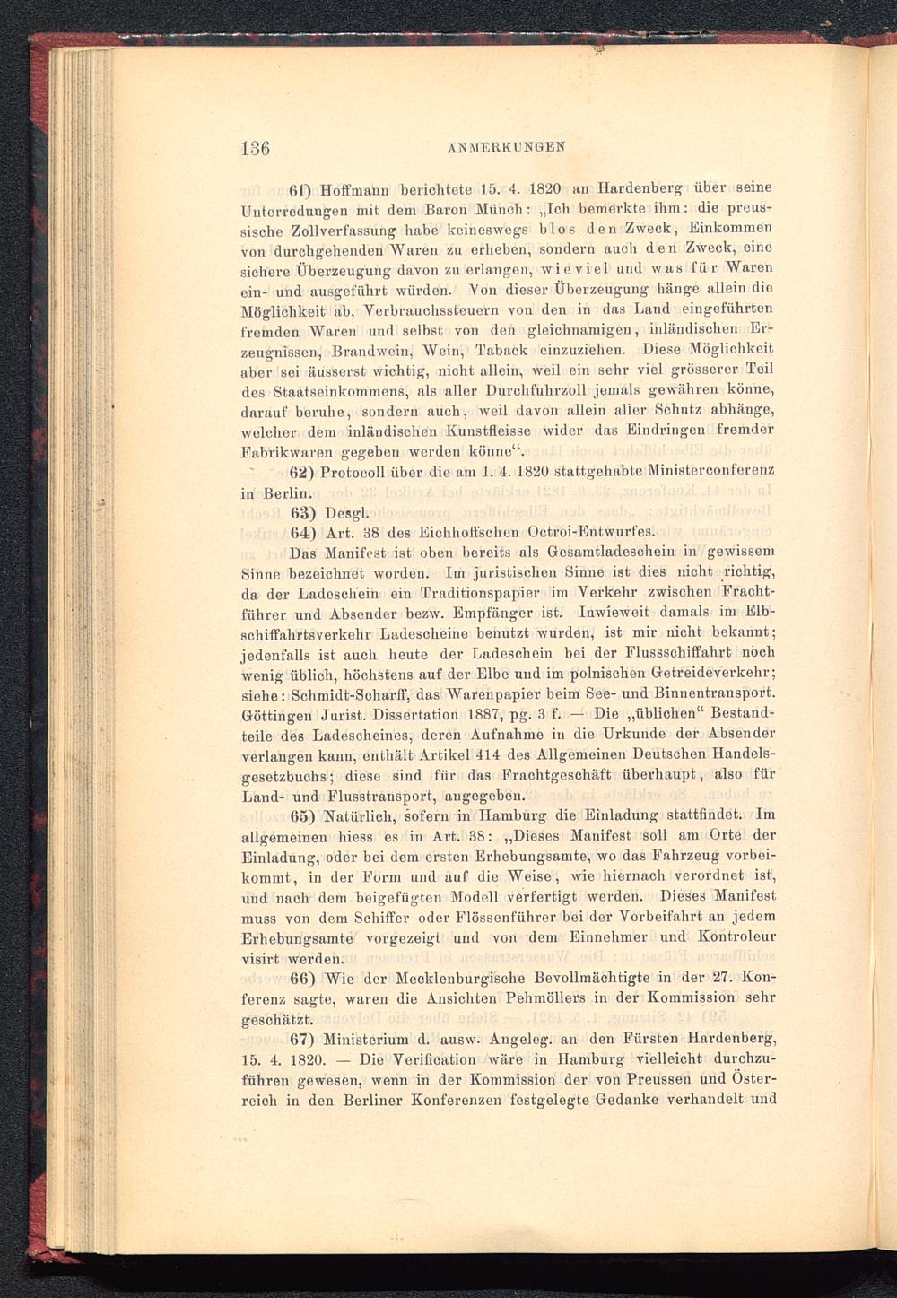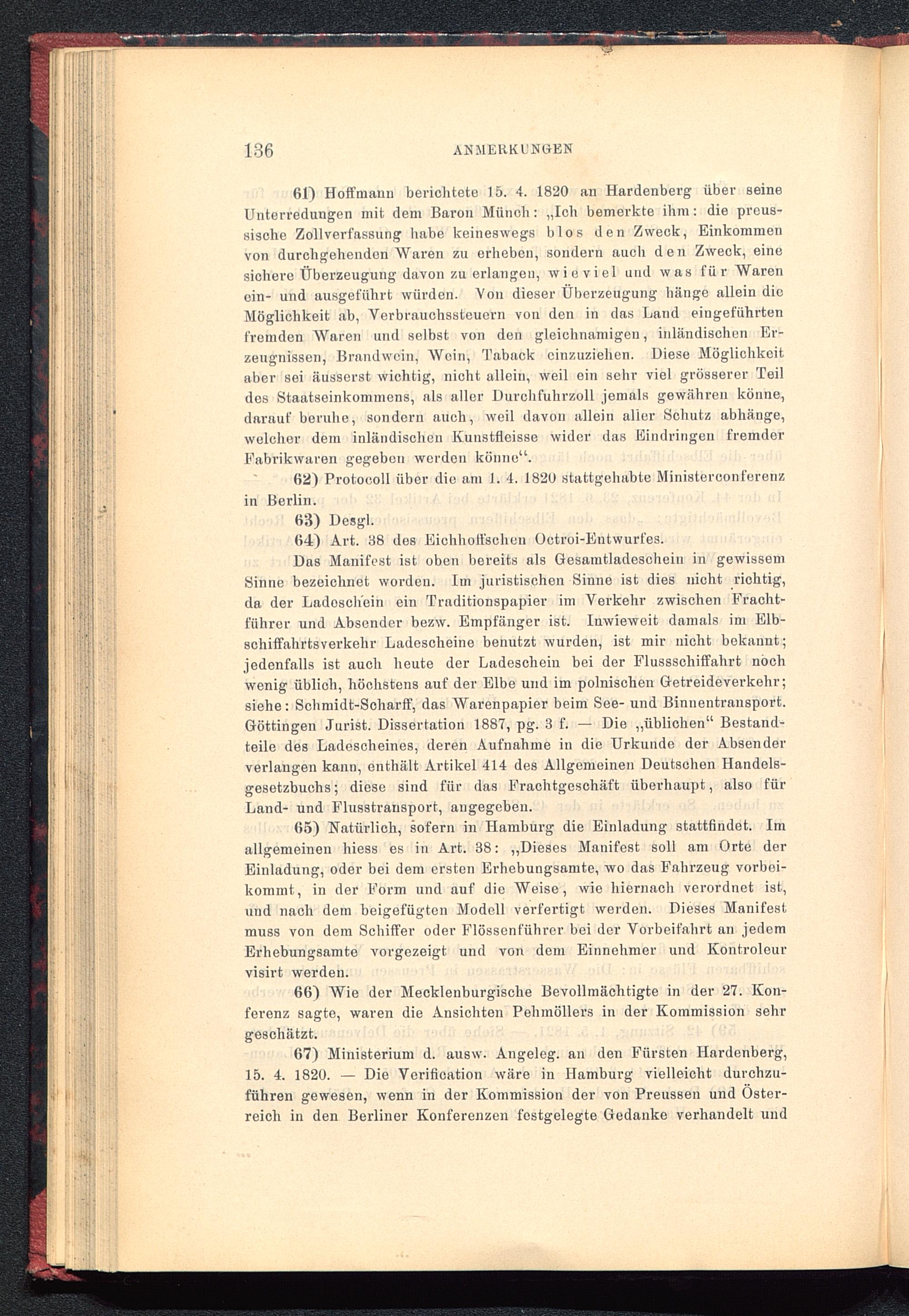 61) Hoffmann berichtete 15. 4. 1820 an Hardenberg über BeineUnterredungen mit dem Baron Münch: „Ich bemerkte ihm: die preus-Bisclie Zollverfassung habe keineswegs blos den Zweck, Einkommenvon durchgehenden Waren zu erheben, sondern auch den Zweck, einesichere Überzeugung davon zu erlangen, wieviel und was für Warenein- und ausgefiihrt würden. Von dieser Überzeugung hänge allein dieMöglichkeit ab, Verbrauchssteuern von den in das Land eiugeführtenfremden Waren und selbst von den gleichnamigen, inländischen Er-zeugnissen, Brandwein, Woin, Taback cinzuziehen. Diese Möglichkeitaber sei äusserst wichtig, nicht allein, weil ein sehr viel grösserer Teildes Staatseinkommens, als aller Durchfuhrzoll jemals gewähren könne,darauf beruhe, sondern auch, weil davon allein alier Schutz abhänge,welcher dem inländischen Itunstfleisse wider das Eindringen fremderFabrikwaren gegeben worden könne“.