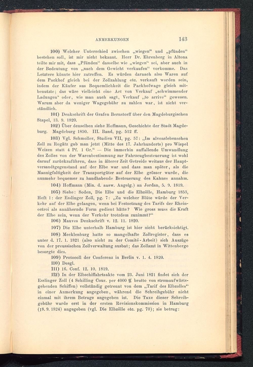 105) Siehe: Soden, Die Elbe und die Elbzölle, Hamburg 1853,Heft 1: der Esslinger Zoll, pg. 7: „Zu welcher Blüte würde der Ver-kehr auf der Elbe gelangen, wenn bei Festsetzung des Tarifs der Rhein -octroi als annähernde Form gedient hätte? Wie gross muss die Kraftder Elbe sein, wenn der Verkehr trotzdem zunimmt?“