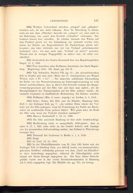 100) Welcher Unterschied zwischen „wiegen“ und „pfünden“bestehen soll, ist mir nicht bekannt. Herr Dr. Ehrenberg in Altona teilte mir mit, dass „Pfünden“ dasselbe wie „wiegen“ sei, aber auch inder Bedeutung von „nach dem Gewicht verkaufen“ vorkomme. DasLetztere könnte hier zutreffen. Es würden darnach also Waren aufdem Packhof gleich bei der Zollzahlung etc. verkauft worden sein,indem der Käufer aus Bequemlichkeit die Packhofwage gleich mit-benutzte; das wäre vielleicht eine Art von Verkauf „schwimmenderLadungen“ oder, wie man auch sagt, Verkauf „to arrive“ gewesen.Warum aber da weniger Wagegebühr zu zahlen war, ist nicht ver-ständlich.