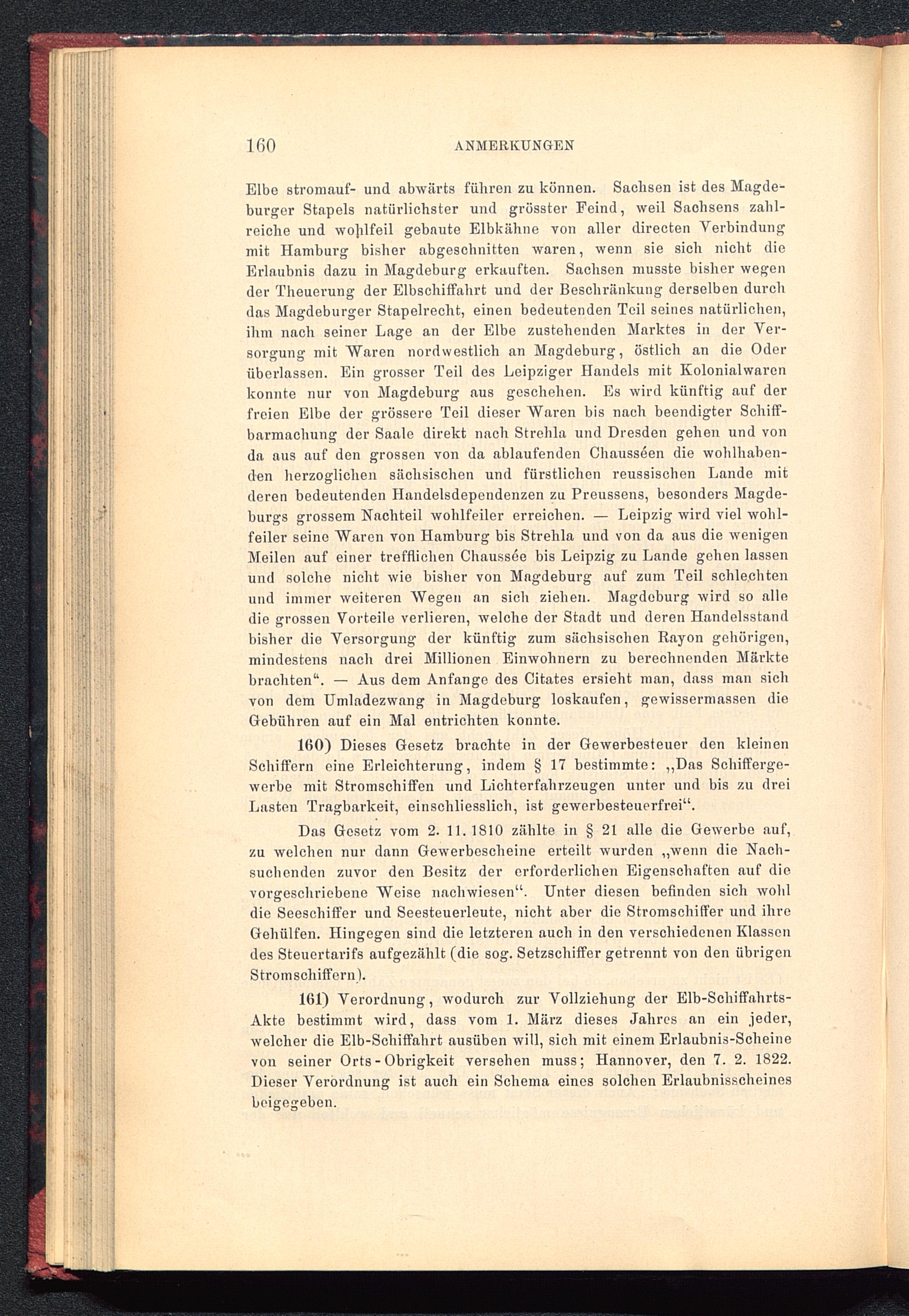 161) Verordnung, wodurch zur Vollziehung der Elb-Schiffahrts-Akte bestimmt wird, dass vom 1. März dieses Jahres an ein jeder,welcher die Elb-Schiffahrt ausüben will, sich mit einem Erlaubnis-Scheinevon seiner Orts - Obrigkeit versehen muss; Hannover , den 7. 2. 1822.Dieser Verordnung ist auch ein Schema eines solchen Erlaubnisscheinesbeigegeben.