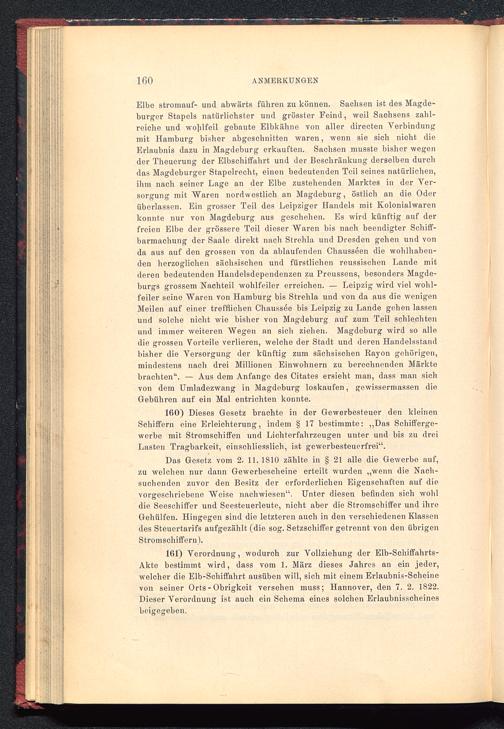 Elbo stromauf- und abwärts führen zu können. Sachsen ist des Magde-burger Stapels natürlichster und grösster Feind, weil Saohsens zahl-reiche und wo]ilfeil gebaute Elbkähne von aller directen Verbindungmit Hamburg bisher abgeschnitten waren, wenn sie sich nicht dieErlaubnis dazu in Magdeburg erkauften. Sachsen musste bisher wegender Theuerung der Elbschiffahrt und der Beschränkung derselben durchdas Magdeburger Stapelrecht, einen bedeutenden Teil seines natürlichen,ihm nach seiner Lage an der Elbe zustehenden Marktes in der Ver-sorgung mit Waren nordwestlich an Magdeburg , östlich an die Oderüberlassen. Ein grosser Teil des Leipziger Handels mit Kolonialwarenkonnte nur von Magdeburg aus geschehen. Es wird künftig auf derfreien Elbe der grössere Teil dieser Waren bis nach beendigter Schiff-barmachung der Saale direkt nach Strehla und Dresden gehen und vonda aus auf den grossen von da ablaufenden Chausseen die wohlhaben-den herzoglichen sächsischen und fürstlichen reussischen Lande mitderen bedeutenden Handelsdependenzen zu Preussens, besonders Magde-burgs grossem Nachteil wohlfeiler erreichen. — Leipzig wird viel wohl-feiler seine Waren von Hamburg bis Strehla und von da aus die wenigenMeilen auf einer trefflichen Chaussee bis Leipzig zu Lande gehen lassenund solche nicht wie bisher von Magdeburg auf zum Teil schlechtenund immer weiteren Wegen an sich ziehen. Magdeburg wird so alledie grossen Vorteile verlieren, welche der Stadt und deren Handelsstandbisher die Versorgung der künftig zum sächsischen Rayon gehörigen,mindestens nach drei Millionen Einwohnern zu berechnenden Märktebrachten“. — Aus dem Anfänge des Citates ersieht man, dass man sichvon dem Umladezwang in Magdeburg loskaufen, gewissermassen dieGebühren auf ein Mal entrichten konnte.