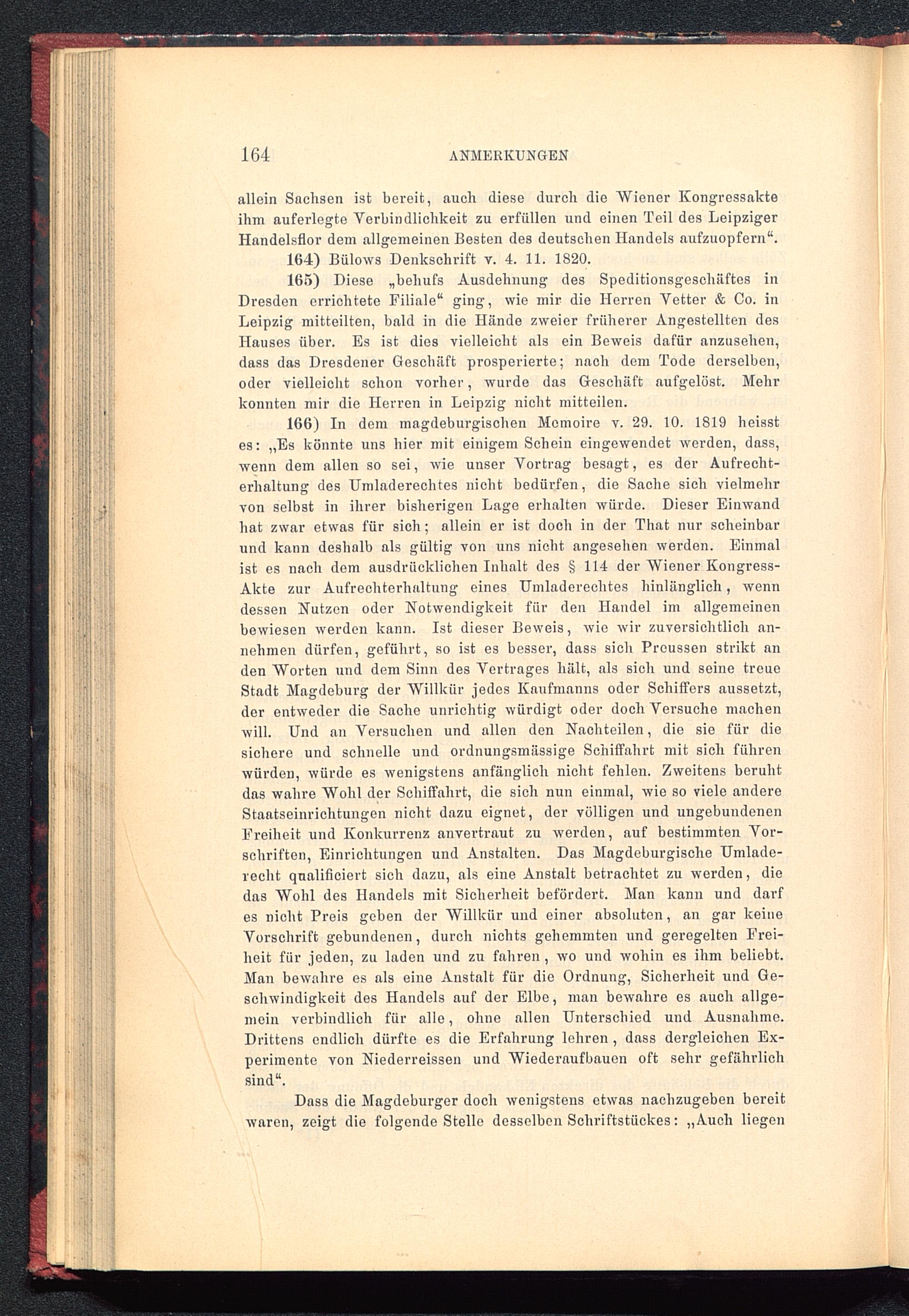 166) In dem magdeburgischen Memoire v. 29. 10. 1819 heisstes: „Es könnte uns hier mit einigem Schein eingewendet werden, dass,wenn dem allen so sei, wie unser Vortrag besagt, es der Aufrecht-erhaltung des Umladerechtes nicht bedürfen, die Sache sich vielmehrvon selbst in ihrer bisherigen Lage erhalten würde. Dieser Einwandhat zwar etwas für sich; allein er ist doch in der That nur scheinbarund kann deshalb als gültig von uns nicht angesehen werden. Einmalist es nach dem ausdrücklichen Inhalt des § 114 der Wiener Kongress-Akte zur Aufreohterhaltung eines Umladerechtes hinlänglich, wenndessen Nutzen oder Notwendigkeit für den Handel im allgemeinenbewiesen werden kann. Ist dieser Beweis, wie wir zuversichtlich an-nehmen dürfen, geführt, so ist es besser, dass sich Prcussen strikt anden Worten und dem Sinn des Vertrages hält, als sich und seine treueStadt Magdeburg der Willkür jedes Kaufmanns oder Schiffers aussetzt,der entweder die Sache unrichtig würdigt oder doch Versuche machenwill. Und an Versuchen und allen den Nachteilen, die sie für diesichere und schnelle und ordnungsmässige Schiffahrt mit sich führenwürden, würde es wenigstens anfänglich nicht fehlen. Zweitens beruhtdas wahre Wohl der Schiffahrt, die sich nun einmal, wie so viele andereStaatseinrichtungen nicht dazu eignet, der völligen und ungebundenenFreiheit und Konkurrenz anvertraut zu werden, auf bestimmten Vor-schriften, Einrichtungen und Anstalten. Das Magdeburgische Umlade-recht qnalificiert sich dazu, als eine Anstalt betrachtet zu werden, diedas Wohl des Handels mit Sicherheit befördert. Man kann und darfes nicht Preis geben der Willkür und einer absoluten, an gar keineVorschrift gebundenen, durch nichts gehemmten und geregelten Frei-heit für jeden, zu laden und zu fahren , wo und wohin es ihm beliebt.Man bewahre es als eine Anstalt für die Ordnung, Sicherheit und Ge-schwindigkeit des Handels auf der Elbe, man bewahre es auch allge-mein verbindlich für alle, ohne allen Unterschied und Ausnahme.Drittens endlich dürfte es die Erfahrung lehren , dass dergleichen Ex-perimente von Niederreissen und Wiederaufbauen oft sehr gefährlichsind“.
