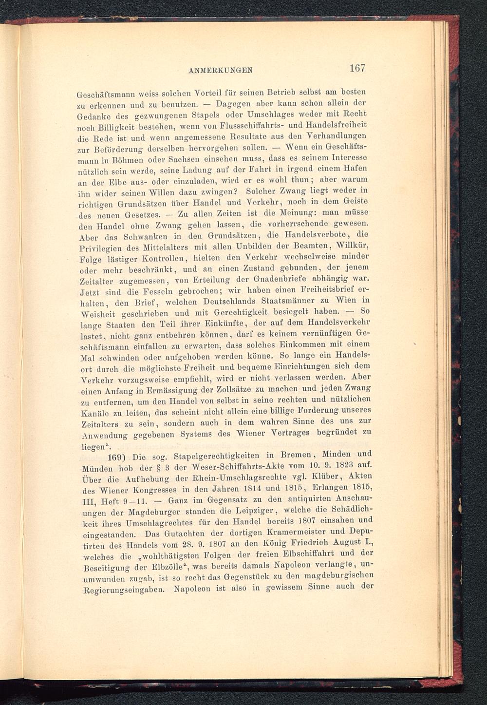 169) Die sog. Stapelgerechtigkeiten in Bremen, Minden undMünden hob der § 3 der Weser-Schiffahrts-Akte vom 10. 9. 1823 auf.Über die Aufhebung der Rhein-Umschlagsrechte vgl. Klüber, Aktendes Wiener Kongresses in den Jahren 1814 und 1815, Erlangen 1815,III, Heft 9 — 11. — Ganz im Gegensatz zu den antiquirten Anschau-ungen der Magdeburger standen die Leipziger, welche die Schädlich-keit ihres Umschlagrechtes für den Handel bereits 1807 einsahen undeingestanden. Das Gutachten der dortigen Kramermeister und Depu-taten des Handels vom 28. 9. 1807 an den König Friedrich August I. ,welches die „wohlthätigsten Folgen der freien Elbschiffahrt und derBeseitigung der Elbzölle“, was bereits damals Napoleon verlangte, un-umwunden zugab, ist so recht das Gegenstück zu den magdeburgischenRegierungseingaben. Napoleon ist also in gewissem Sinne auch der