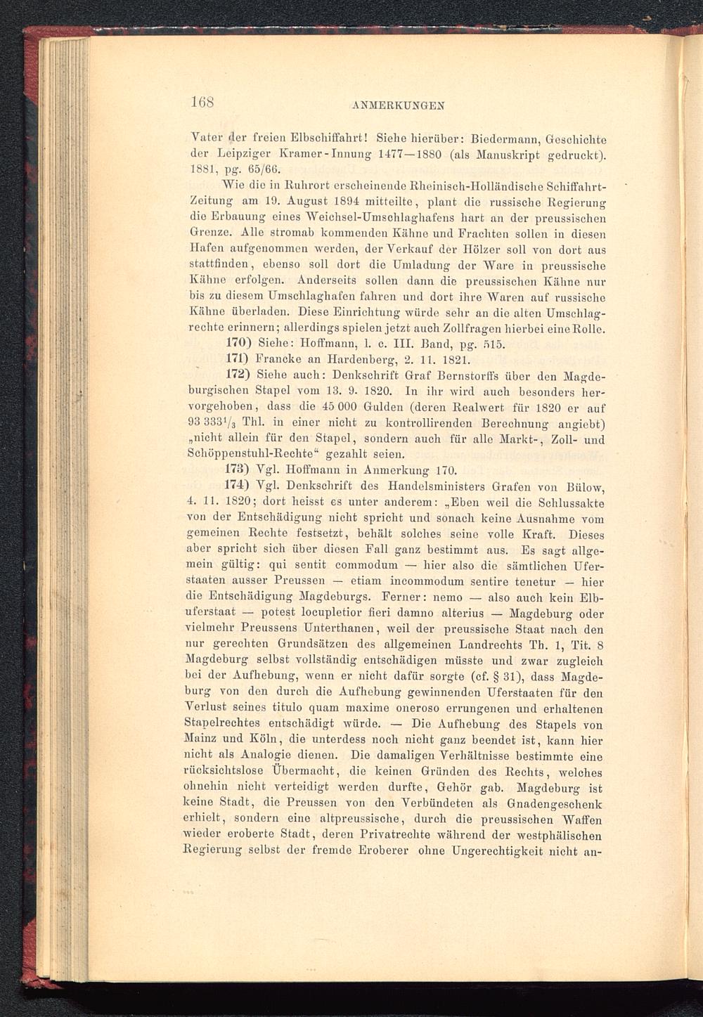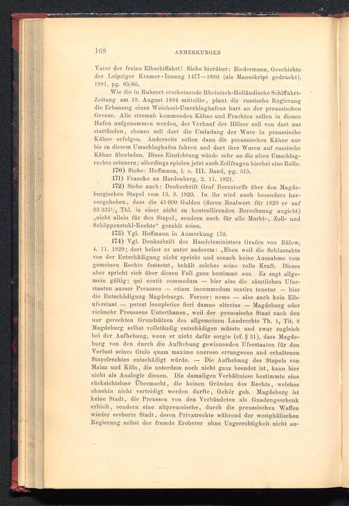 174) Vgl. Denkschrift des Handclsministers Grafen von Bülow,4. 11. 1820; dort heisst es unter anderem: „Eben weil die Schlussaktevon der Entschädigung nicht spricht und sonach keine Ausnahme vomgemeinen Rechte festsetzt, behält solches seine volle Kraft. Diesesaber spricht sich über diesen Fall ganz bestimmt aus. Es sagt allge-mein gültig: qui sentit commodum — hier also die sämtlichen Ufer-staaten ausser Preussen — etiam incommodum sentire tenetur — hierdie Entschädigung Magdeburgs . Ferner: nemo — also auch kein Elb-uferstaat — potest locupletior fieri damno alterius — Magdeburg odervielmehr Preussens Untertlianen, weil der preussische Staat nach dennur gerechten Grundsätzen des allgemeinen Landrechts Th. 1, Tit. 8Magdeburg selbst vollständig entschädigen müsste und zwar zugleichbei der Aufhebung, wenn er nicht dafür sorgte (cf. § 31), dass Magde-burg von den durch die Aufhebung gewinnenden Uferstaaten für denVerlust seines titulo quam maxime oneroso errungenen und erhaltenenStapelrechtes entschädigt würde. — Die Aufhebung des Stapels vonMainz und Köln , die unterdess noch nicht ganz beendet ist, kann hiernicht als Analogie dienen. Die damaligen Verhältnisse bestimmte einerücksichtslose Übermacht, die keinen Gründen des Rechts, welchesohnehin nicht verteidigt werden durfte, Gehör gab. Magdeburg istkeine Stadt, die Preussen von den Verbündeten als Gnadengeschenkerhielt, sondern eine altpreussische, durch die preussischen Waffenwieder eroberte Stadt, deren Privatreehte während der westphälischenRegierung selbst der fremde Eroberer ohne Ungerechtigkeit nicht an-