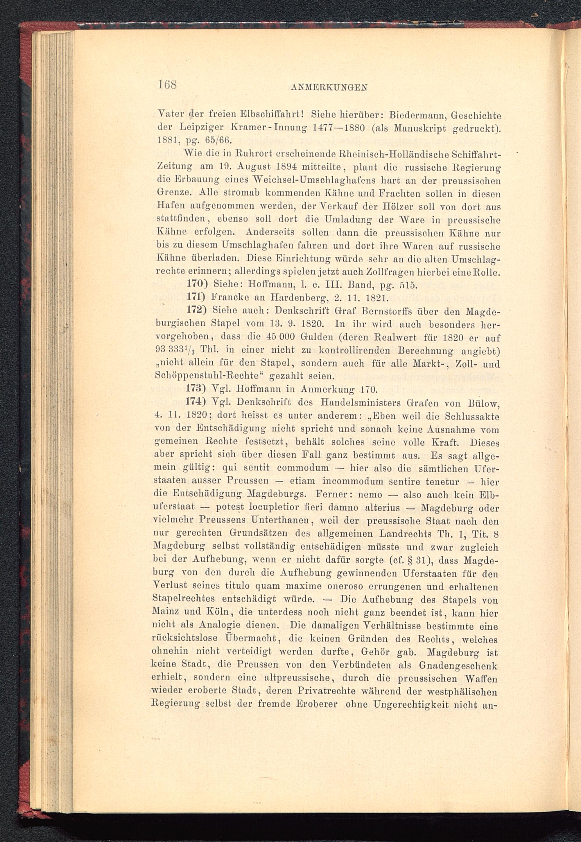172) Siehe auch: Denkschrift Graf Bernstorft's über den Magde-burgischen Stapel vom 13. 9. 1820. In ihr wird auch besonders her-vorgehoben , dass die 45 000 Gulden (deren Realwert für 1820 er auf93 333'/ 3 Thl. in einer nicht zu kontrollirenden Berechnung angiebt)„nicht allein für den Stapel, sondern auch für alle Markt-, Zoll- undSchüppenstuhl-Rechte“ gezahlt seien.