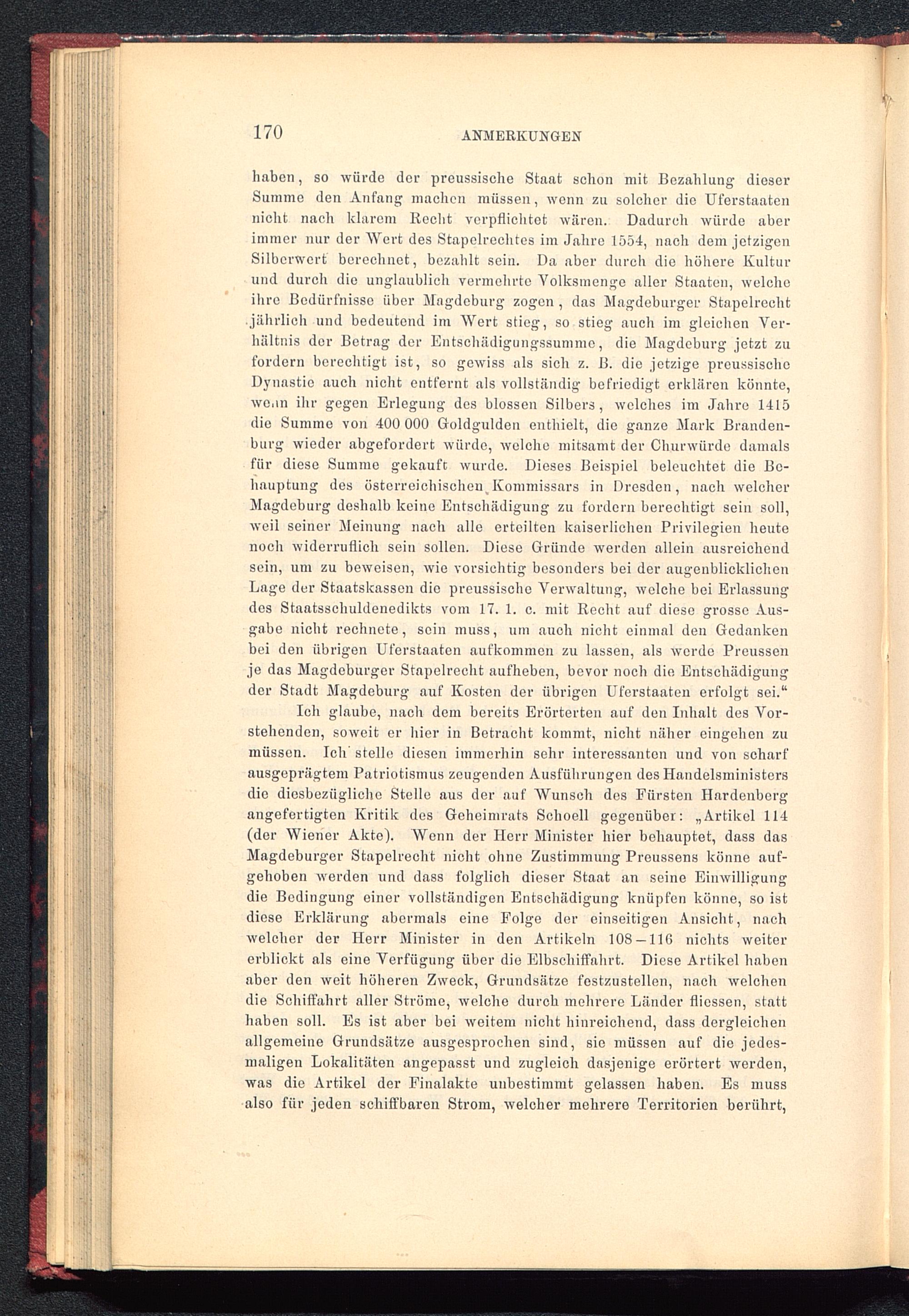 haben, so würde der preussischo Staat schon mit Bezahlung dieserSumme den Anfang machen müssen, wenn zu solcher die Uferstaatennicht nach klarem Recht vcrpfliehtot wären. Dadurch würde aberimmer nur der Wert des Stapelrechtes im Jahre 1554, nach dem jetzigenSilberwert berechnet, bezahlt sein. Da aber durch die höhere Kulturund durch die unglaublich vermehrte Volksmenge aller Staaten, welcheihre Bedürfnisse über Magdeburg zogen , das Magdeburger Stapelrechtjährlich und bedeutend im Wert stieg, so stieg auch im gleichen Ver-hältnis der Betrag der Entschädigungssumme, die Magdeburg jetzt zufordern berechtigt ist, so gewiss als sieh z. B. die jetzige preussischoDynastie auch nicht entfernt als vollständig befriedigt erklären könnte,wenn ihr gegen Erlegung des blossen Silbers, welches im Jahre 1415die Summe von 400 000 Goldgulden enthielt, die ganze Mark Branden-burg wieder abgefordert würde, welche mitsamt der Churwürde damalsfür diese Summe gekauft wurde. Dieses Beispiel beleuchtet die Be-hauptung des österreichischen^Kommissars in Dresden , nach welcherMagdeburg deshalb keine Entschädigung zu fordern berechtigt sein soll,weil seiner Meinung nach alle erteilten kaiserlichen Privilegien heutenoch widerruflich sein sollen. Diese Gründe werden allein ausreichendsein, um zu beweisen, wie vorsichtig besonders bei der augenblicklichenLage der Staatskassen die preussischo Verwaltung, welche bei Erlassungdos Staatsschuldenedikts vom 17. 1. c. mit Recht auf diese grosse Aus-gabe nicht rechnete, sein muss, um auch nicht einmal den Gedankenbei den übrigen Uferstaaten aufkommen zu lassen, als werde Proussenje das Magdeburger Stapelreeht aufheben, bevor noch die Entschädigungder Stadt Magdeburg auf Kosten der übrigen Uferstaaten erfolgt sei.“Ich glaube, nach dem bereits Erörterten auf den Inhalt des Vor-stehenden, soweit er hier in Betracht kommt, nicht näher cingehcn zumüssen. Ich stelle diesen immerhin sehr interessanten und von scharfausgeprägtem Patriotismus zeugenden Ausführungen des Ilaudelsministersdie diesbezügliche Stelle aus der auf Wunsch des Fürsten Hardenberg angefertigten Kritik des Goheimrats Schoell gegenüber: „Artikel 114(der Wiener Akte). Wenn der Herr Minister hier behauptet, dass dasMagdeburger Stapelrecht nicht ohne Zustimmung Preussens könne auf-gehoben werden und dass folglich dieser Staat an seine Einwilligungdie Bedingung einer vollständigen Entschädigung knüpfen könne, so istdiese Erklärung abermals eine Folge der einseitigen Ansicht, nachwelcher der Herr Minister in den Artikeln 108 —116 nichts weitererblickt als eine Verfügung über die Elbschiffahrt. Diese Artikel habenaber den weit höheren Zweck, Grundsätze festzustellen, nach welchendie Schiffahrt aller Ströme, welche durch mehrere Länder fliossen, statthaben soll. Es ist aber bei weitem nicht hinreichend, dass dergleichenallgemeine Grundsätze ausgesprochen sind, sie müssen auf die jedes-maligen Lokalitäten angepasst und zugleich dasjenige erörtert werden,was die Artikel der Finalakte unbestimmt gelassen haben. Es mussalso für jeden schiffbaren Strom, welcher mehrere Territorien berührt,