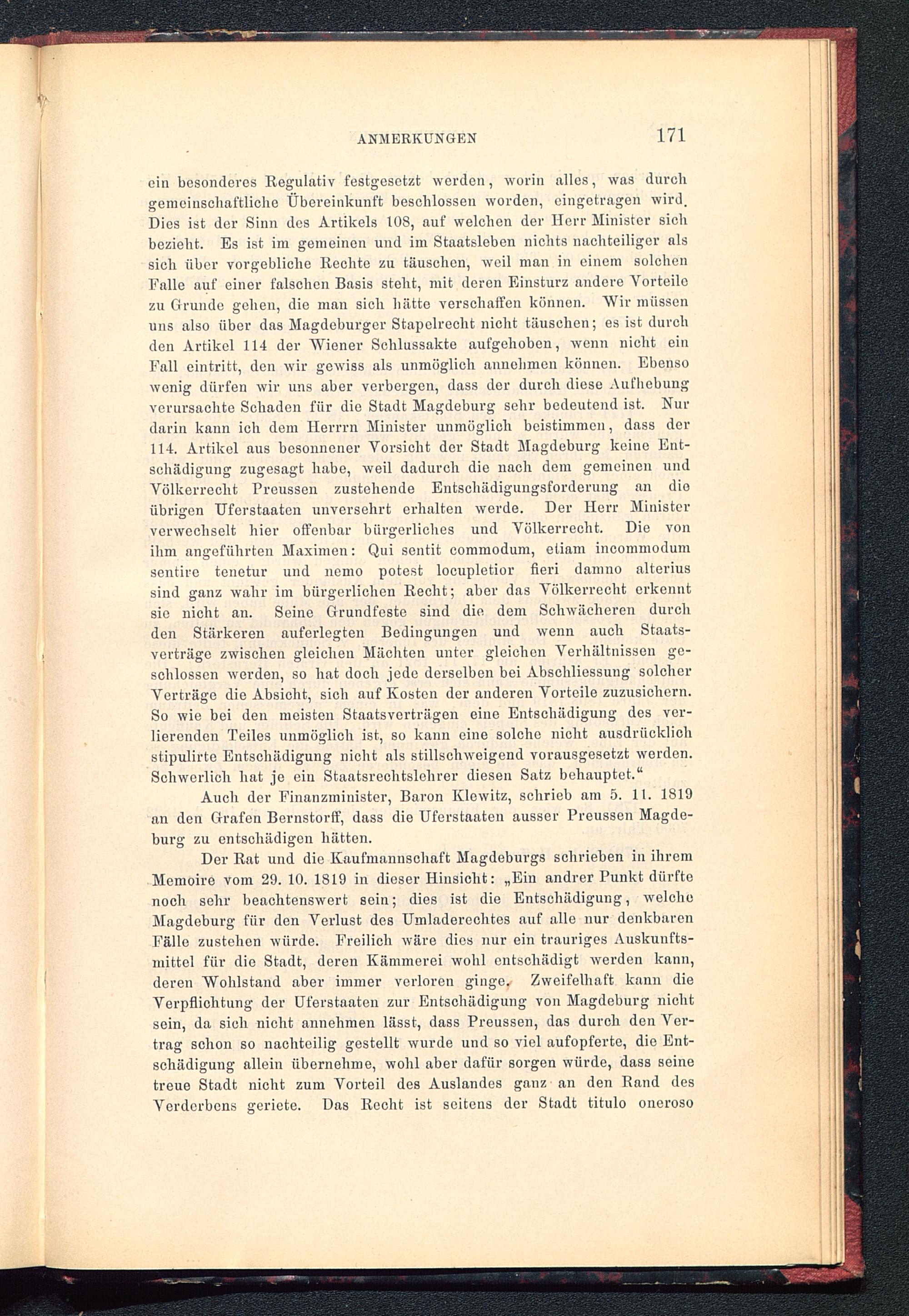 ein besonderes Regulativ festgesetzt werden, worin alles, was durchgemeinschaftliche Übereinkunft beschlossen worden, eingetragen wird.Dies ist der Sinn dos Artikels 108, auf welchen der Herr Minister sichbezieht. Es ist im gemeinen und im Staatsleben nichts nachteiliger alssich über vorgebliche Rechte zu täuschen, weil man in einem solchenFalle auf einer falschen Basis steht, mit deren Einsturz andere Vorteilezu Grunde gehen, die man sich hätte verschaffen können. Wir müssenuns also über das Magdeburger Stapolrecht nicht täuschen; es ist durchden Artikel 114 der Wiener Schlussakte aufgehoben, wenn nicht einFall eintritt, den wir gewiss als unmöglich annohmen können. Ebensowenig dürfen wir uns aber verbergen, dass der durch diese Aufhebungverursachte Schaden für die Stadt Magdeburg sehr bedeutend ist. Nurdarin kann ich dem Ilerrrn Minister unmöglich beistimmen, dass der114. Artikel aus besonnener Vorsicht der Stadt Magdeburg keine Ent-schädigung zugesagt habe, weil dadurch die nach dem gemeinen undVölkerrecht Proussen zustehende Entschädigungsforderung an dieübrigen Uferstaaton unversehrt erhalten werde. Der Herr Ministerverwechselt hier offenbar bürgerliches und Völkerrecht. Die vonihm angeführten Maximen: Qui sentit commodum, eliam incommodumsentiro tenetur und nemo potest locupletior fieri damno alteriussind ganz wahr im bürgerlichen Recht; aber das Völkerrecht erkenntsie nicht an. Seine Grundfeste sind die dem Schwächeren durchden Stärkeren nuferlegten Bedingungen und wenn auch Staats-verträgo zwischen gleichen Mächten unter gleichen Verhältnissen ge-schlossen werden, so hat doch jede derselben bei Abschliessung solcherVerträge die Absicht, sich auf Kosten der anderen Vorteile zuzusichern.So wie bei den meisten Staatsvorträgen eine Entschädigung des ver-lierenden Teiles unmöglich ist, so kann eine solche nicht ausdrücklichstipulirte Entschädigung nicht als stillschweigend vorausgesetzt werden.Schwerlich hat jo ein Staatsrechtslehrer diesen Satz behauptet.“