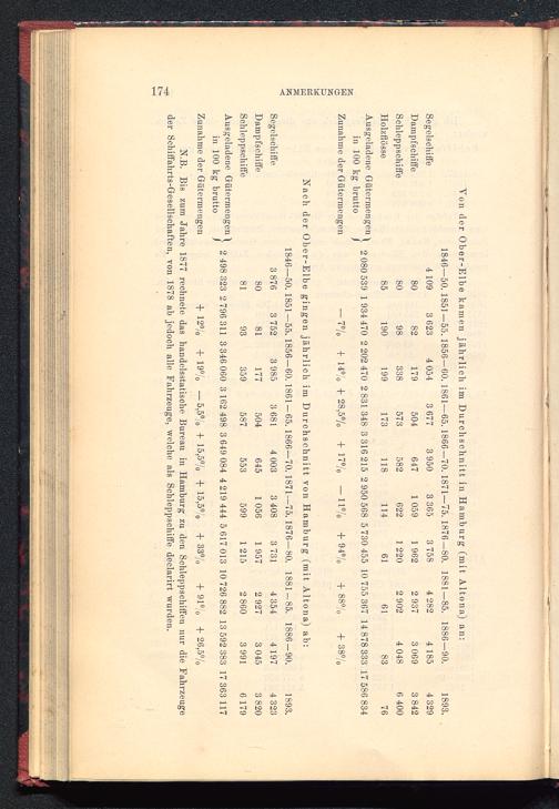 N.B. Bis zum Jahre 1877 rechnete das handelsstatische Bureau in Hamburg zu den Schleppschiffen nur die Fahrzeugeder Schiffahrts-Gesellschaften, von 1878 ab jedoch alle Fahrzeuge, welche als Schleppschiffe declarirt wurden.