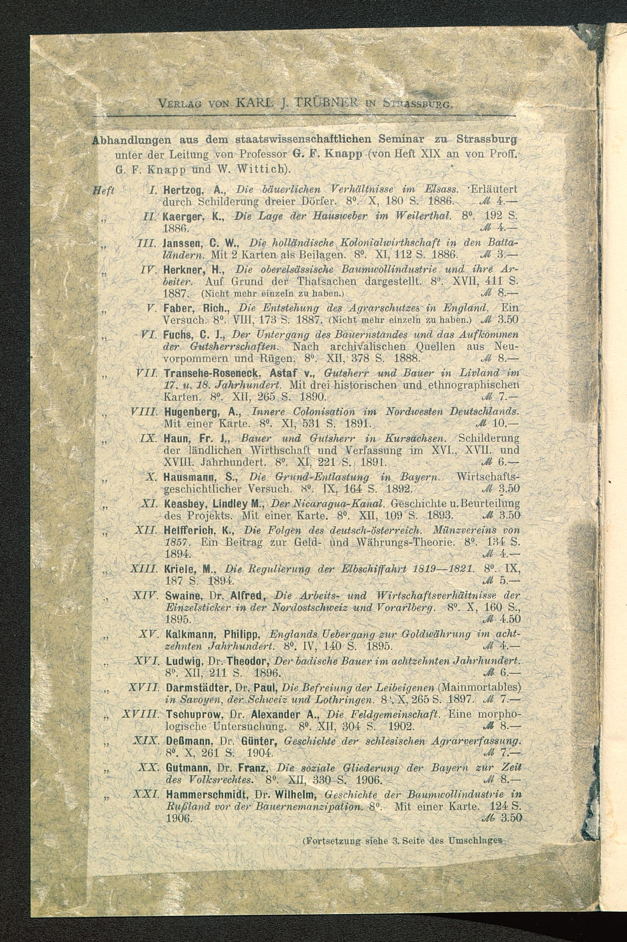 Abhandlungen aus dem staatswissenschaftlichen Seminar 2m Strassburg unter der Leitung von Professor G. F. Knapp (von Heft XIX an von Proff.G. F. Knapp und W. Wittich).