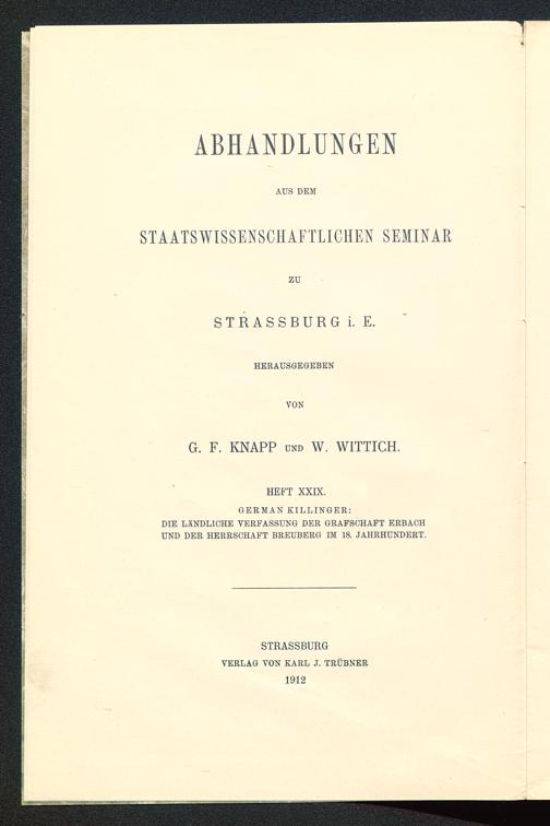ABHANDLUNGENAUS DKMSTAATSWISSENSCHAFTLICHEN SEMINARzuSTRASSBURG i. E.HERAUSGEGEBENVONG. F. KNAPP und W. WITTICH.HEFT XXIX.GERMAN KILLINGER:DIE LÄNDLICHE VERFASSUNG DER GRAFSCHAFT ERBACH UND DER HERRSCHAFT BREUBERG IM 18. JAHRHUNDERT.STRASSBURG VERLAG VON KARL J. TRÜBNER1912