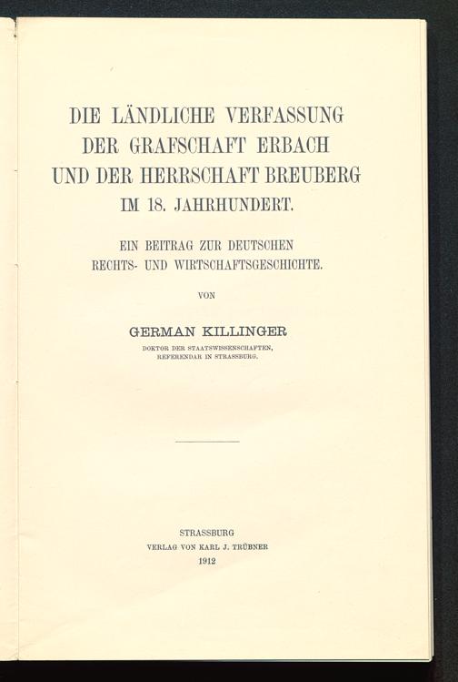 DIE LÄNDLICHE VERFASSUNGDER GRAFSCHAFT ERBACHUND DER HERRSCHAFT BREUBERGIM 18. JAHRHUNDERT.EIN BEITRAG ZUR DEUTSCHENRECHTS- UND WIRTSCHAFTSGESCHICHTE.GERMAN KILLINGERDOKTOR DER STAATSWISSENSCHAFTEN ,REFERENDAR JN STRASSBURG .STRASSBURG VERLAG VON KARL J. TRÜBNER1912