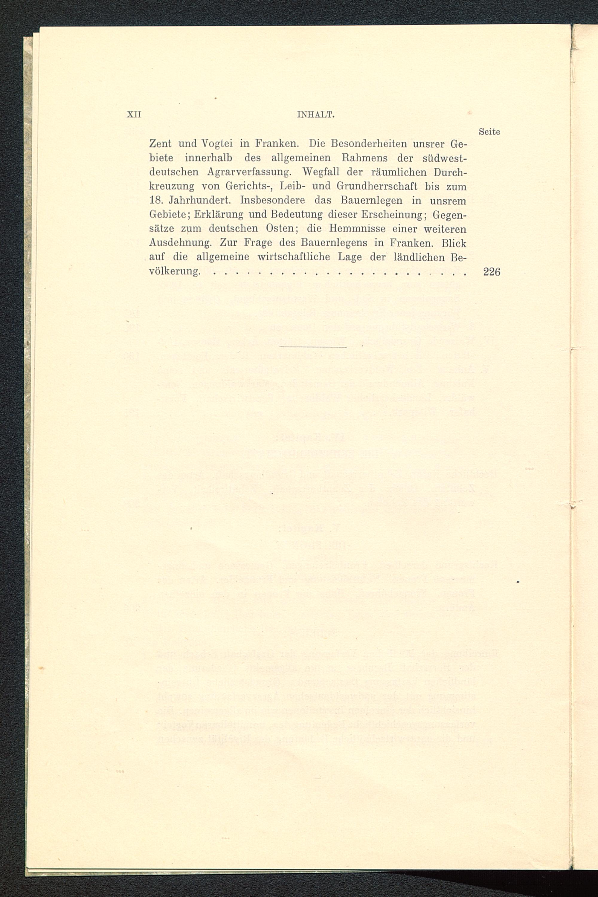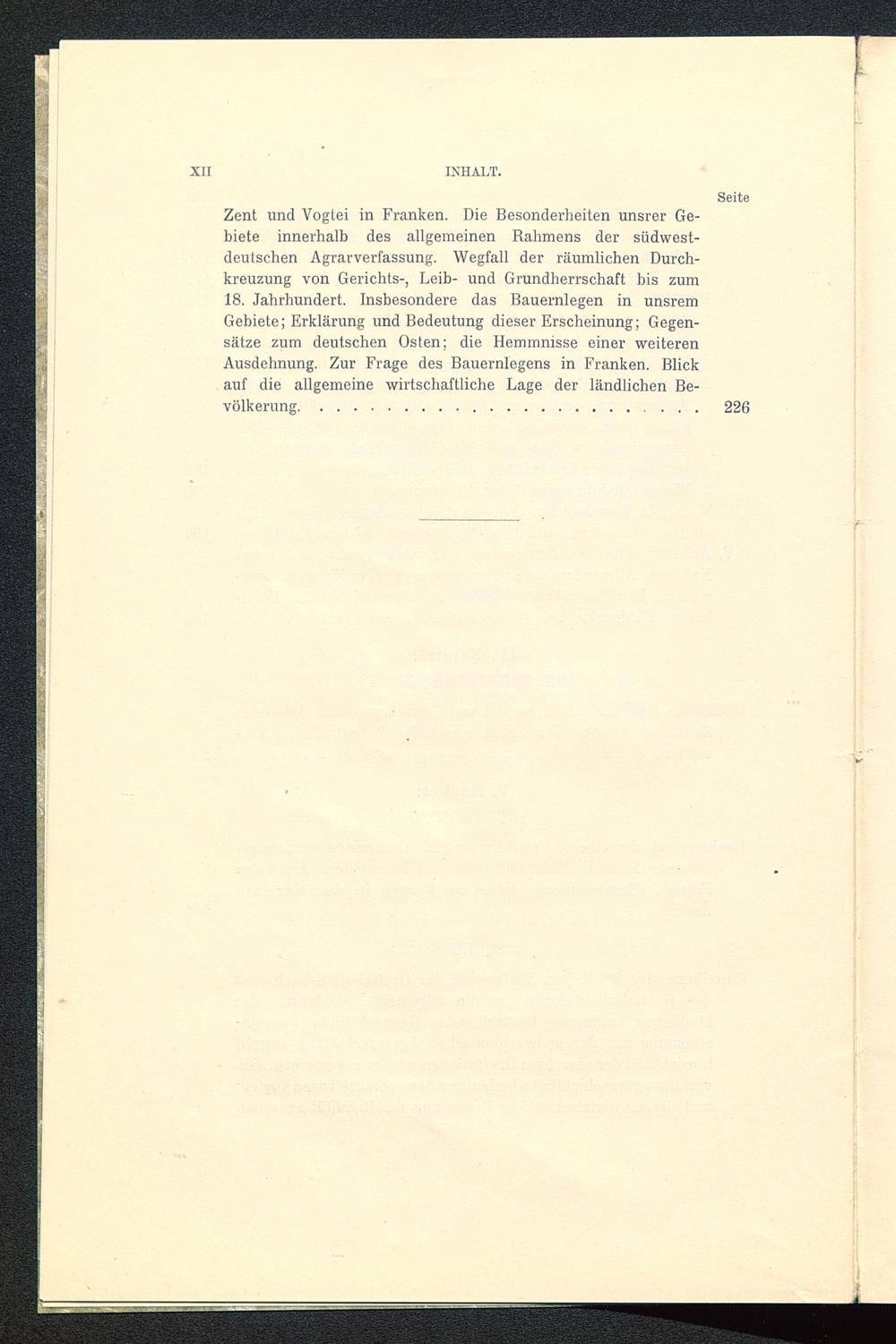 Zent und Vogtei in Franken. Die Besonderheiten unsrer Ge-biete innerhalb des allgemeinen Rahmens der südwest-deutschen Agrarverfassung. Wegfall der räumlichen Durch-kreuzung von Gerichts-, Leib- und Grundherrschaft bis zum18. Jahrhundert. Insbesondere das Bauernlegen in unsremGebiete; Erklärung und Bedeutung dieser Erscheinung; Gegen-sätze zum deutschen Osten; die Hemmnisse einer weiterenAusdehnung. Zur Frage des Bauernlegens in Franken. Blickauf die allgemeine wirtschaftliche Lage der ländlichen Be-völkerung. 226