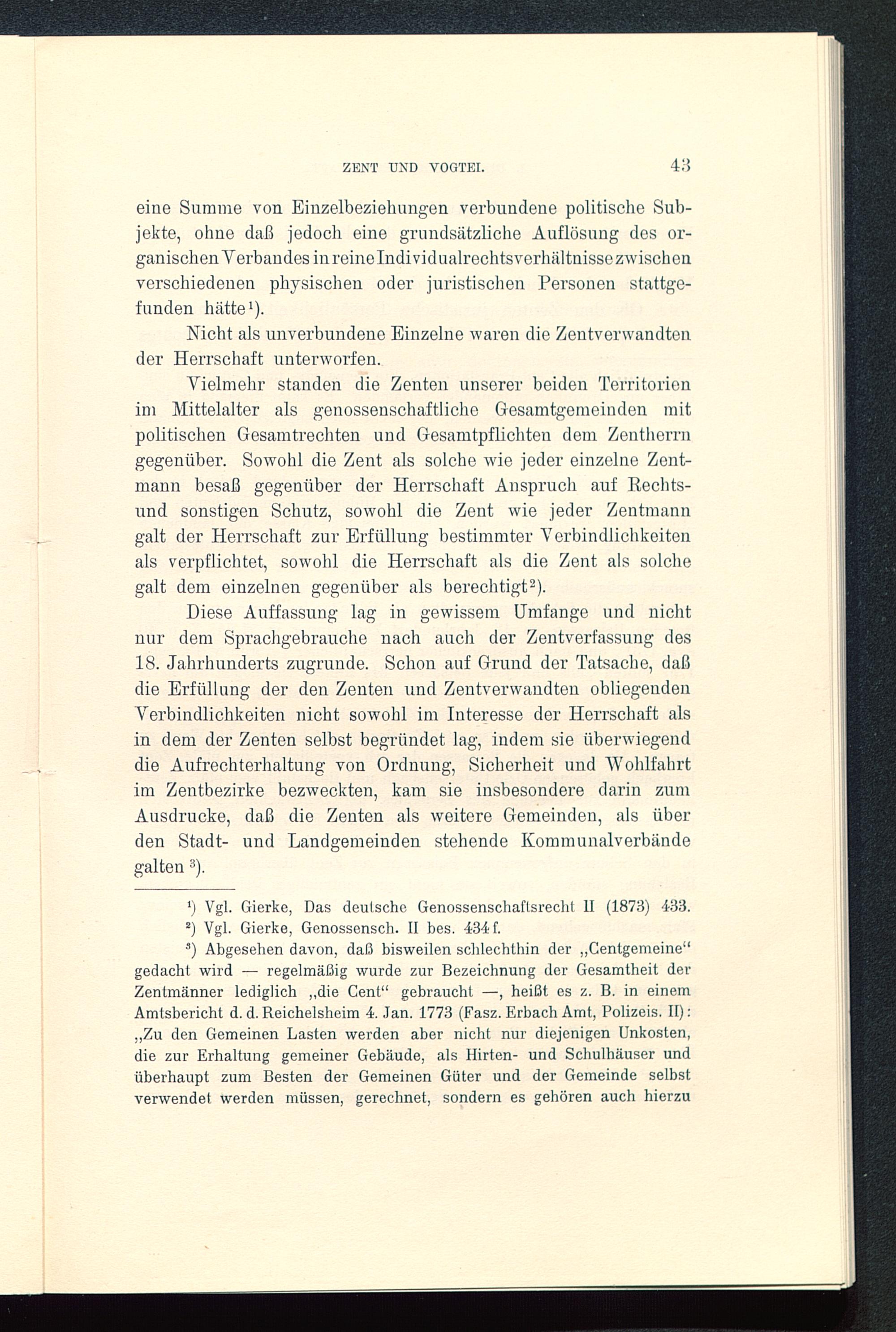 Diese Auffassung lag in gewissem Umfange und nichtnur dem Sprachgebrauche nach auch der Zentverfassung des18. Jahrhunderts zugrunde. Schon auf Grund der Tatsache, daßdie Erfüllung der den Zenten und Zentverwandten obliegendenVerbindlichkeiten nicht sowohl im Interesse der Herrschaft alsin dem der Zenten selbst begründet lag, indem sie überwiegenddie Aufrechterhaltung von Ordnung, Sicherheit und 'Wohlfahrtim Zentbezirke bezweckten, kam sie insbesondere darin zumAusdrucke, daß die Zenten als weitere Gemeinden, als überden Stadt- und Landgemeinden stehende Kommunalverbändegalten 3 ).