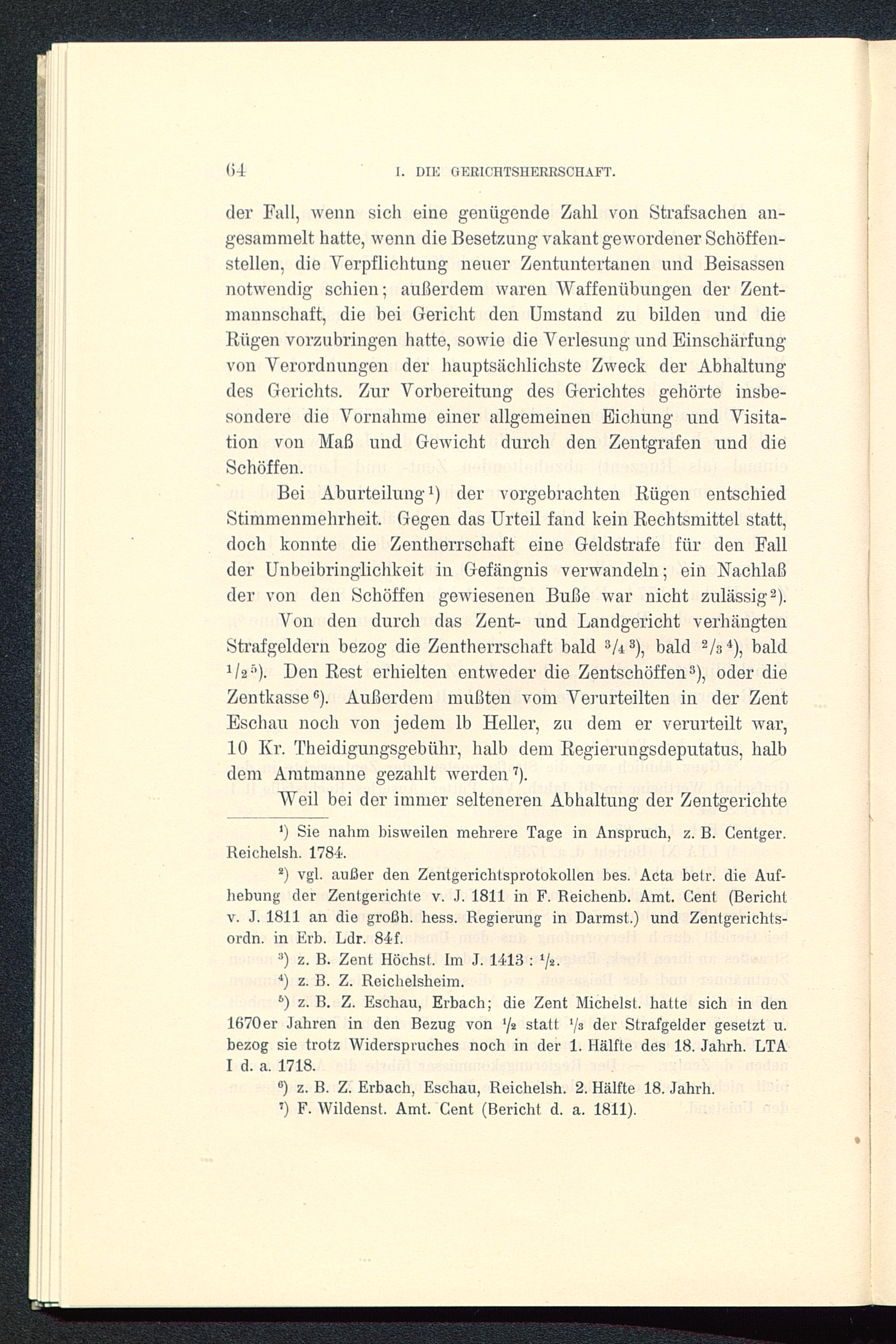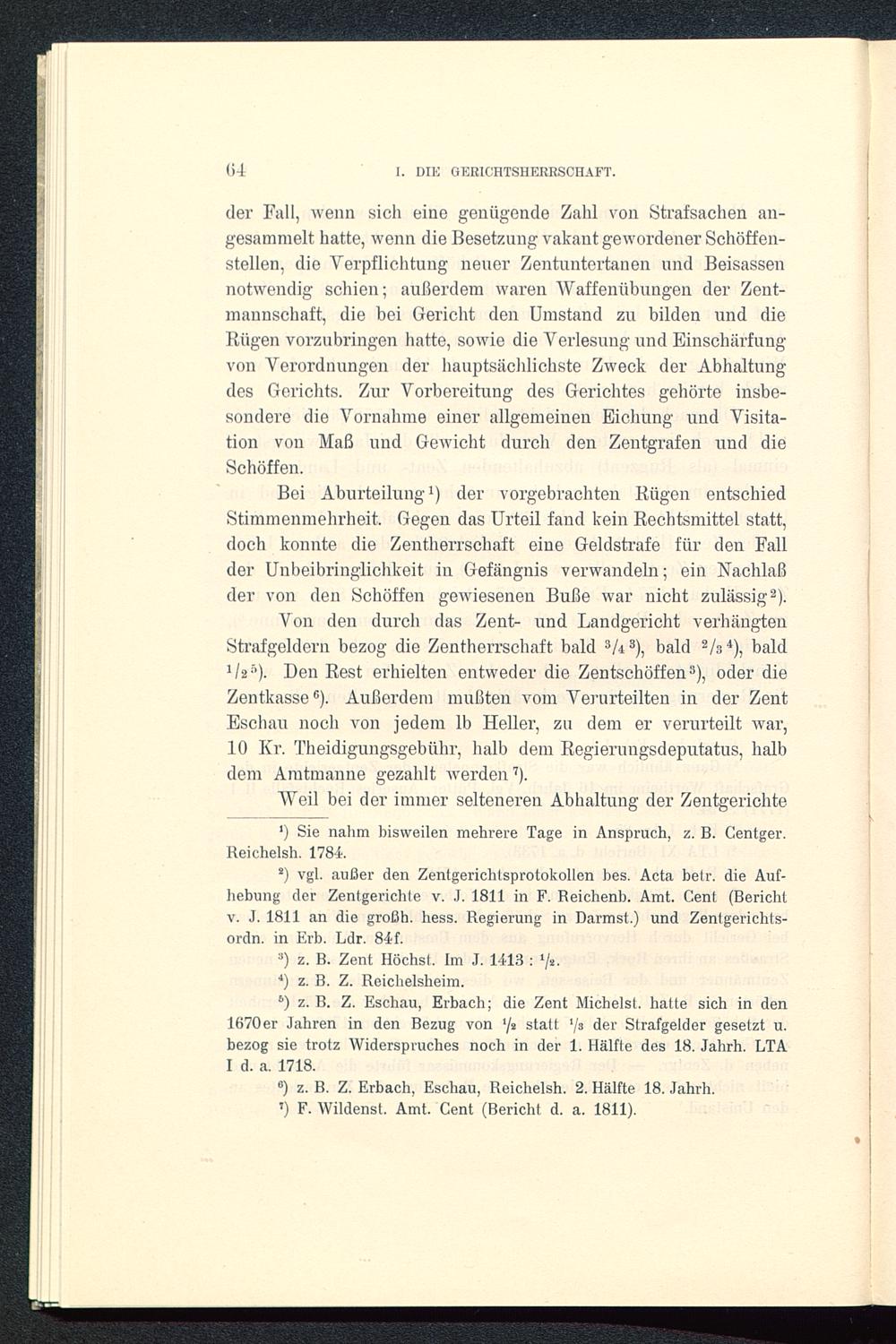 6 ) z. B. Z. Eschau, Erbach; die Zent Michelst, hatte sich in den1670er Jahren in den Bezug von 1 js statt ‘/a der Strafgelder gesetzt u.bezog sie trotz Widerspruches noch in der 1. Hälfte des 18. Jahrh. LTAI d. a. 1718.