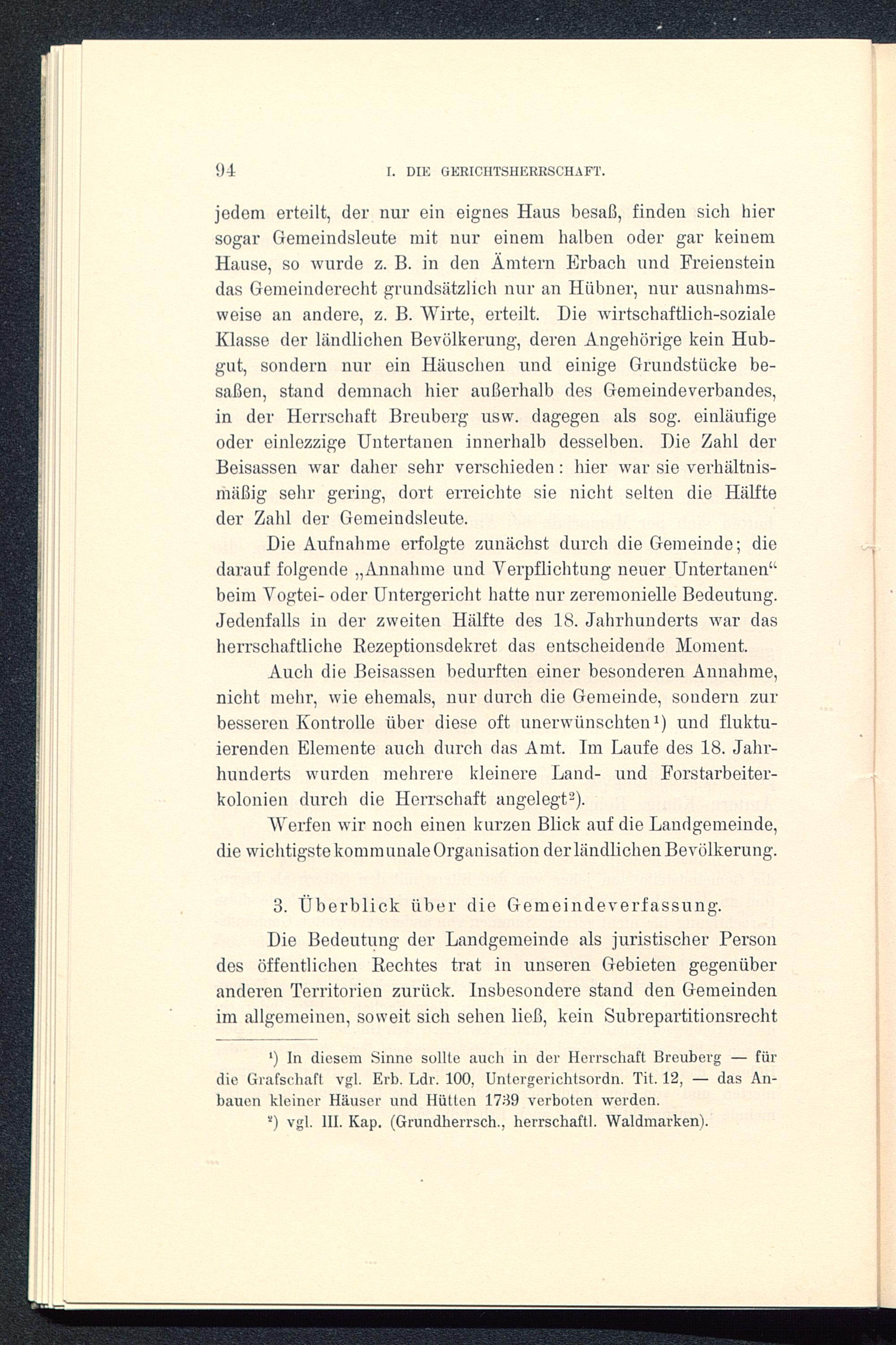 jedem erteilt, der nur ein eignes Haus besaß, finden sich hiersogar Gemeindsleute mit nur einem halben oder gar keinemHause, so wurde z. B. in den Ämtern Erbach und Freiensteindas Gemeinderecht grundsätzlich nur an Hübner, nur ausnahms-weise an andere, z. B. Wirte, erteilt. Die wirtschaftlich-sozialeKlasse der ländlichen Bevölkerung, deren Angehörige kein Hub-gut, sondern nur ein Häuschen und einige Grundstücke be-saßen, stand demnach hier außerhalb des Gemeindeverbandes,in der Herrschaft Breuberg usw. dagegen als sog. einläufigeoder einlezzige Untertanen innerhalb desselben. Die Zahl derBeisassen war daher sehr verschieden: hier war sie verhältnis-mäßig sehr gering, dort erreichte sie nicht selten die Hälfteder Zahl der Gemeindsleute.