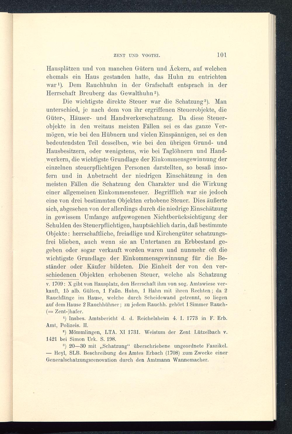 3 ) 20—30 mit „Schatzung“ überschriebene ungeordnete Faszikel.— Heyl, SLR. Beschreibung des Amtes Erbach (1708) zum Zwecke einerGeneralschatzungsrenovation durch den Amtmann Wannemacher.