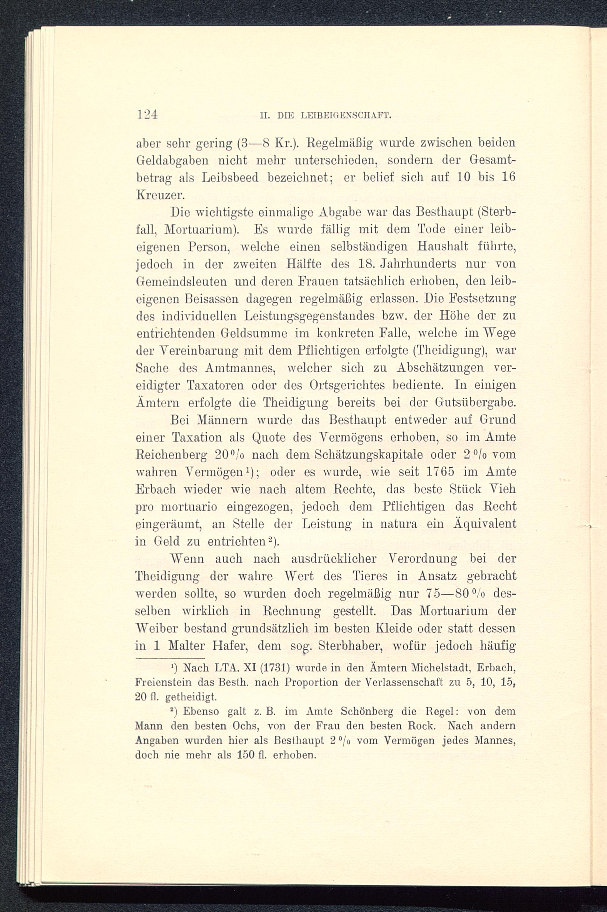 Bei Männern wurde das Besthaupt entweder auf Grundeiner Taxation als Quote des Vermögens erhoben, so im AmteReichenberg 20°/o nach dem Schätzungskapitale oder 2 °/o vomwahren Vermögen 1 ); oder es wurde, wie seit 1765 im AmteErbach wieder wie nach altem Rechte, das beste Stück Viehpro mortuario eingezogen, jedoch dem Pflichtigen das Rechteingeräumt, an Stelle der Leistung in natura ein Äquivalentin Geld zu entrichten 2 ).
