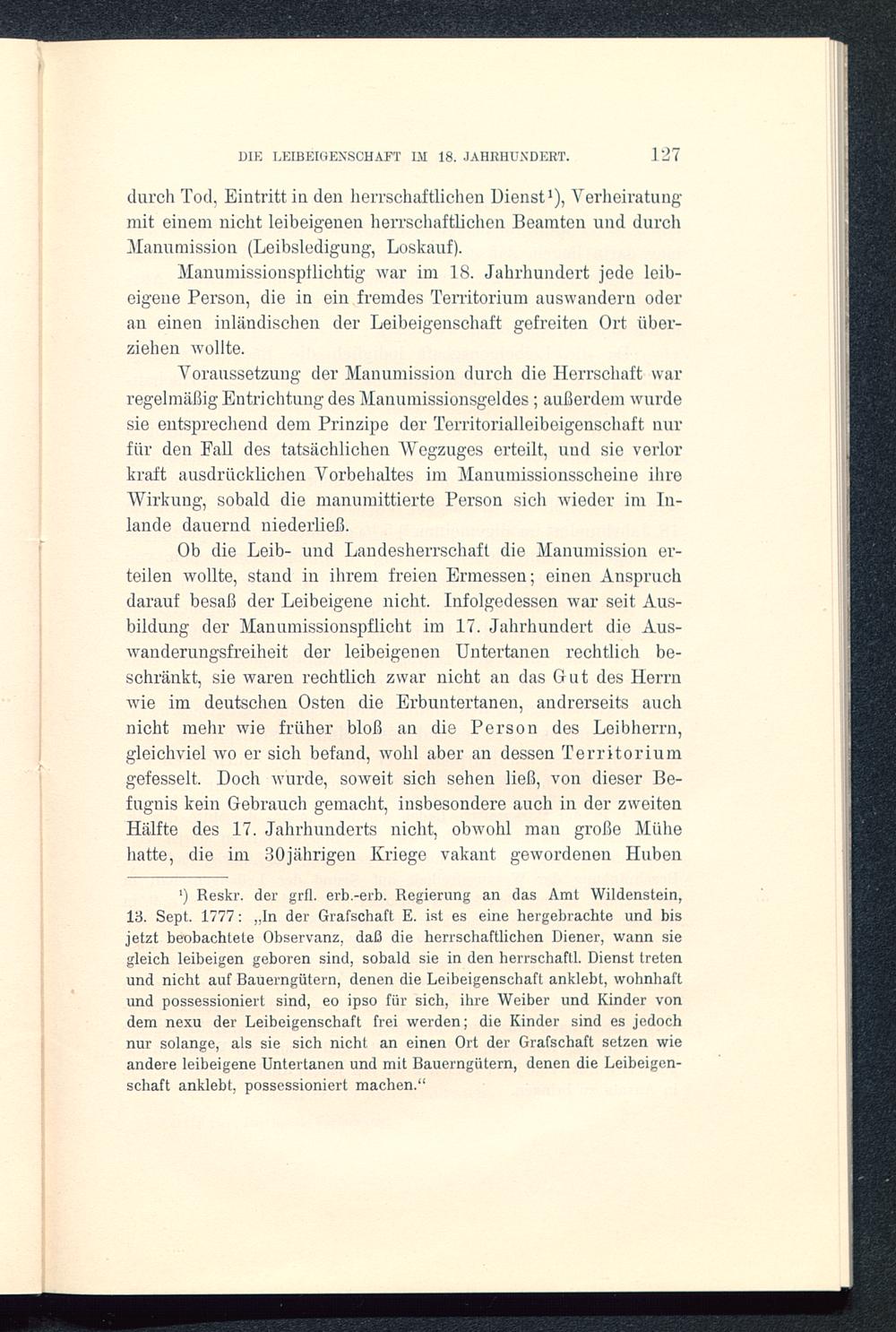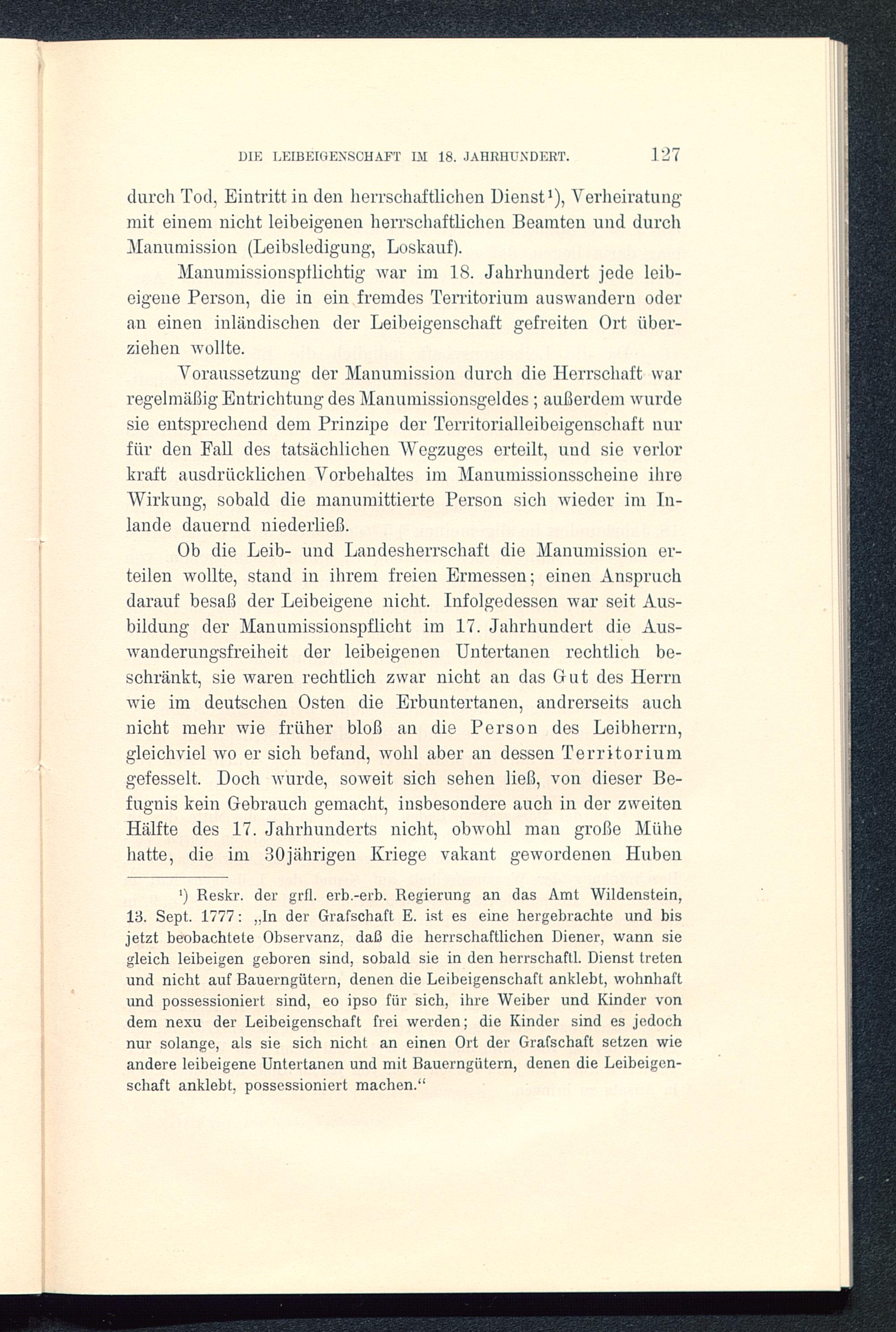 Voraussetzung der Manumission durch die Herrschaft warregelmäßig Entrichtung des Manumissionsgeldes; außerdem wurdesie entsprechend dem Prinzipe der Territorialleibeigenschaft nurfür den Fall des tatsächlichen Wegzuges erteilt, und sie verlorkraft ausdrücklichen Vorbehaltes im Manumissionsscheine ihreWirkung, sobald die manumittierte Person sich wieder im In-lande dauernd niederließ.