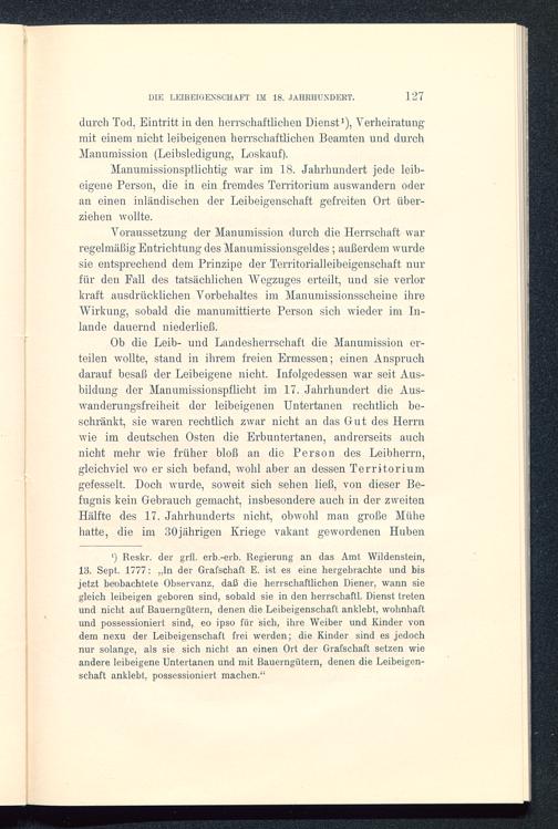 Ob die Leib- und Landesherrschaft die Manumission er-teilen wollte, stand in ihrem freien Ermessen; einen Anspruchdarauf besaß der Leibeigene nicht. Infolgedessen war seit Aus-bildung der Manumissionspflicht im 17. Jahrhundert die Aus-wanderungsfreiheit der leibeigenen Untertanen rechtlich be-schränkt, sie waren rechtlich zwar nicht an das Gut des Herrnwie im deutschen Osten die Erbuntertanen, andrerseits auchnicht mehr wie früher bloß an die Person des Leibherrn,gleichviel wo er sich befand, wohl aber an dessen Territoriumgefesselt. Doch wurde, soweit sich sehen ließ, von dieser Be-fugnis kein Gebrauch gemacht, insbesondere auch in der zweitenHälfte des 17. Jahrhunderts nicht, obwohl man große Mühehatte, die im 30jährigen Kriege vakant gewordenen Huben
