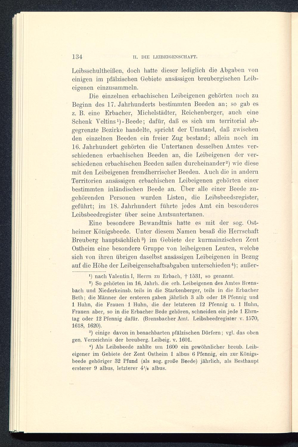 Eine besondere Bewandtnis hatte es mit der sog. Ost-heimer Königsbeede. Unter diesem Namen besaß die HerrschaftBreuberg hauptsächlich 3 ) im Gebiete der kurmainzischen ZentOstheim eine besondere Gruppe von leibeigenen Leuten, welchesich von ihren übrigen daselbst ansässigen Leibeigenen in Bezugauf die Höhe der Leibeigenschaftsabgaben unterschieden 4 ); außer-