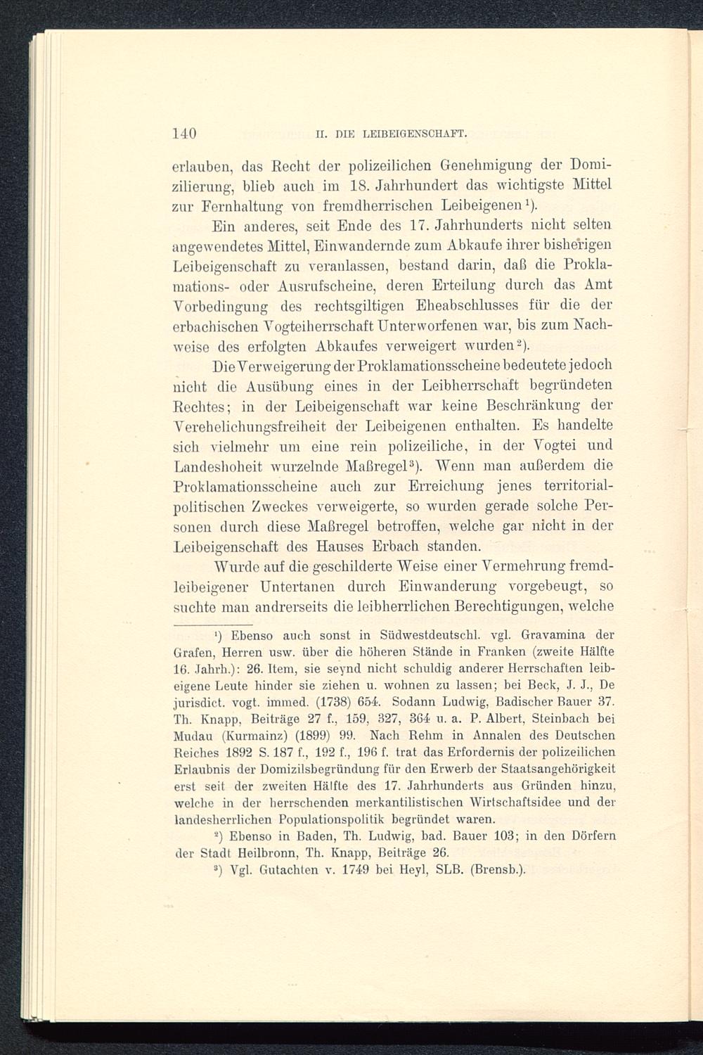 Die Verweigerung der Proklamationsscheine bedeutete jedochnicht die Ausübung eines in der Leibherrschaft begründetenRechtes; in der Leibeigenschaft war keine Beschränkung derVerehelichungsfreiheit der Leibeigenen enthalten. Es handeltesich vielmehr um eine rein polizeiliche, in der Vogtei undLandeshoheit wurzelnde Maßregel 3 ). Wenn man außerdem dieProklamationsscheine auch zur Erreichung jenes territorial-politischen Zweckes verweigerte, so wurden gerade solche Per-sonen durch diese Maßregel betroffen, welche gar nicht in derLeibeigenschaft des Hauses Erbach standen.