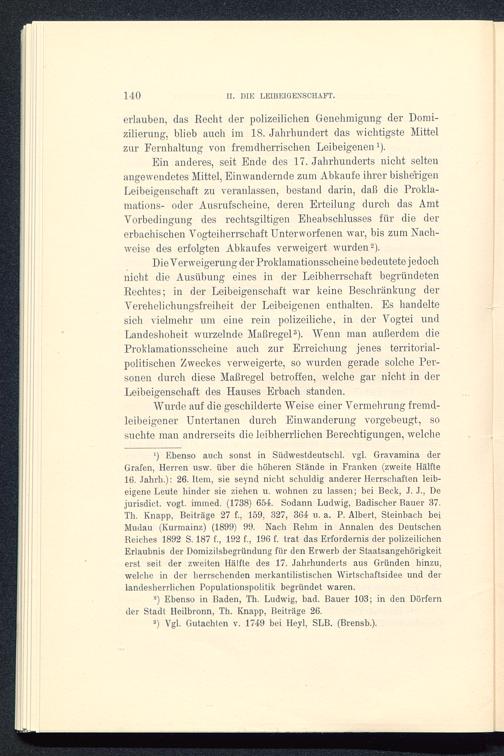 ‘) Ebenso auch sonst in Südwestdeutschl. vgl. Gravamina derGrafen , Herren usw. über die höheren Stände in Franken (zweite Hälfte16. Jahrh.): 26. Item, sie seynd nicht schuldig anderer Herrschaften leib-eigene Leute liinder sie ziehen u. wohnen zu lassen; bei Beck, J. J., Dejurisdict. vogt. immed. (1738) 654. Sodann Ludwig, Badischer Bauer 37.Th. Knapp, Beiträge 27 f., 159, 327, 364 u. a. P. Albert. Steinbach beiMudau (Kurmainz ) (1899) 99. Nach Rehm in Annalen des DeutschenReiches 1892 S. 187 f., 192 f., 196 f. trat das Erfordernis der polizeilichenErlaubnis der Domizilsbegründung für den Erwerb der Staatsangehörigkeiterst seit der zweiten Hälfte des 17. Jahrhunderts aus Gründen hinzu,welche in der herrschenden merkantilistischen Wirtschaftsidee und derlandesherrlichen Populationspolitik begründet waren.