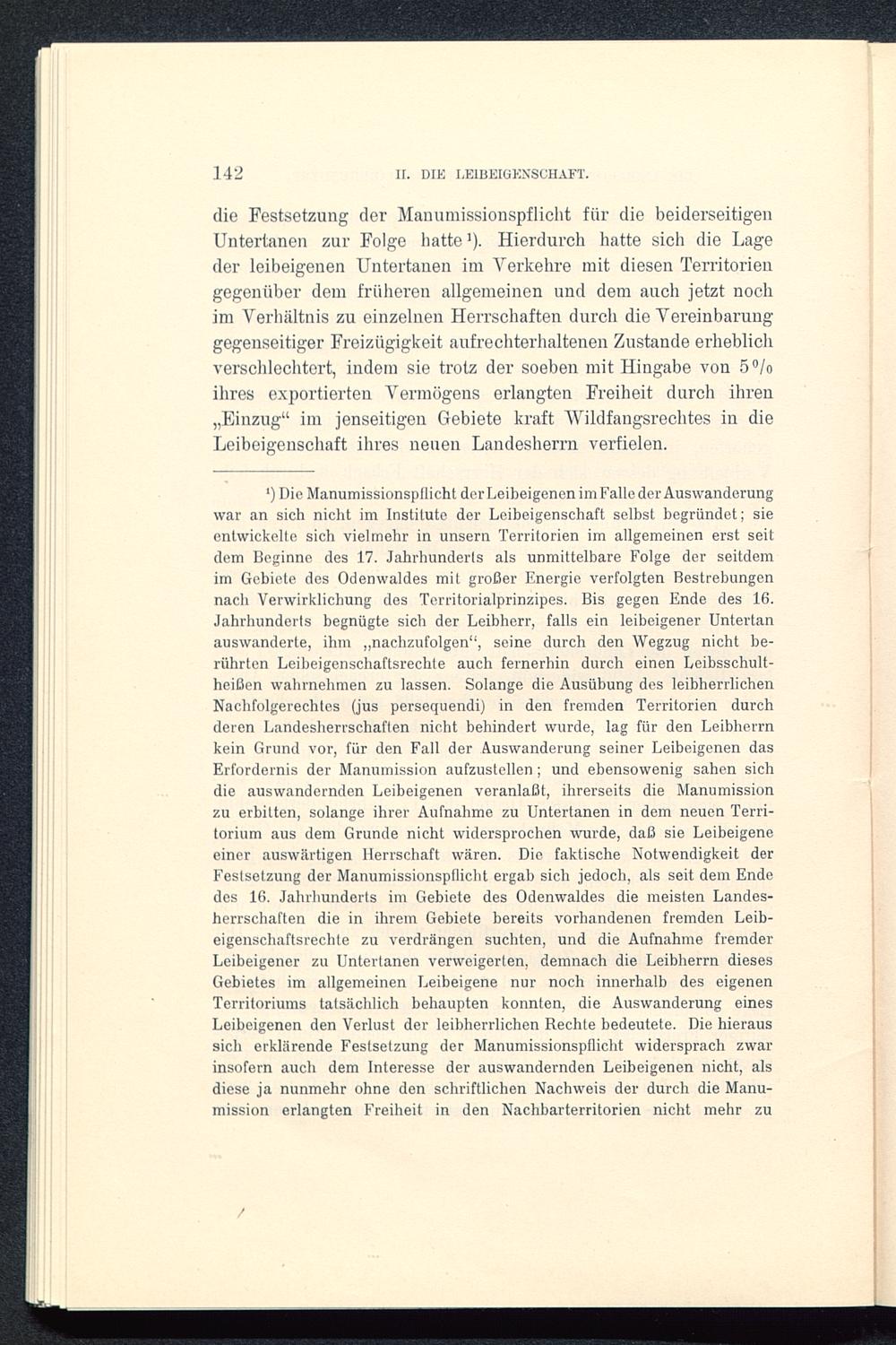 ‘)Die Manumissionspflicht der Leibeigenen im Falle der Auswanderungwar an sich nicht im Institute der Leibeigenschaft selbst begründet; sieentwickelte sich vielmehr in unsern Territorien im allgemeinen erst seitdem Beginne des 17. Jahrhunderts als unmittelbare Folge der seitdemim Gebiete des Odenwaldes mit großer Energie verfolgten Bestrebungennach Verwirklichung des Territorialprinzipes. Bis gegen Ende des 16.Jahrhunderts begnügte sich der Leibherr, falls ein leibeigener Untertanauswanderte, ihm „nachzufolgen“, seine durch den Wegzug nicht be-rührten Leibeigenschaftsrechte auch fernerhin durch einen Leibsschult-heißen wahrnehmen zu lassen. Solange die Ausübung des leibherrlichenNachfolgerechtes (jus persequendi) in den fremden Territorien durchderen Landesherrschaflen nicht behindert wurde, lag für den Leibherrnkein Grund vor, für den Fall der Auswanderung seiner Leibeigenen dasErfordernis der Manumission aufzustellen ; und ebensowenig sahen sichdie auswandernden Leibeigenen veranlaßt, ihrerseits die Manumissionzu erbitten, solange ihrer Aufnahme zu Untertanen in dem neuen Terri-torium aus dem Grunde nicht widersprochen wurde, daß sie Leibeigeneeiner auswärtigen Herrschaft wären. Die faktische Notwendigkeit derFestsetzung der Manumissionspflicht ergab sich jedoch, als seit dem Endedes 16. Jahrhunderts im Gebiete des Odenwaldes die meisten Landes-herrschaften die in ihrem Gebiete bereits vorhandenen fremden Leib-eigenschaftsrechte zu verdrängen suchten, und die Aufnahme fremderLeibeigener zu Untertanen verweigerten, demnach die Leibherrn diesesGebietes im allgemeinen Leibeigene nur noch innerhalb des eigenenTerritoriums tatsächlich behaupten konnten, die Auswanderung einesLeibeigenen den Verlust der leibherrlichen Rechte bedeutete. Die hieraussich erklärende Festsetzung der Manumissionspflicht widersprach zwarinsofern auch dem Interesse der auswandernden Leibeigenen nicht, alsdiese ja nunmehr ohne den schriftlichen Nachweis der durch die Manu-mission erlangten Freiheit in den Nachbarterritorien nicht mehr zu