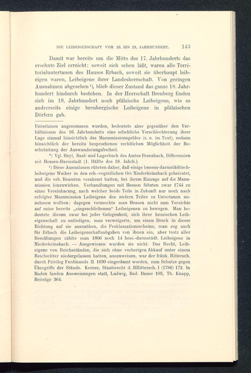 Damit war bereits um die Mitte des 17. Jahrhunderts dasersehnte Ziel erreicht: soweit sich sehen läßt, waren alle Terri-torialuntertanen des Hauses Erbach , soweit sie überhaupt leib-eigen waren, Leibeigene ihrer Landesherrschaft. Von geringenAusnahmen abgesehen 1 ), blieb dieser Zustand das ganze 18. Jahr-hundert hindurch bestehen. In der Herrschaft Breuberg findensich im 18. Jahrhundert noch pfälzische Leibeigene, wie esandrerseits einige breubergische Leibeigene in pfälzischenDörfern gab.