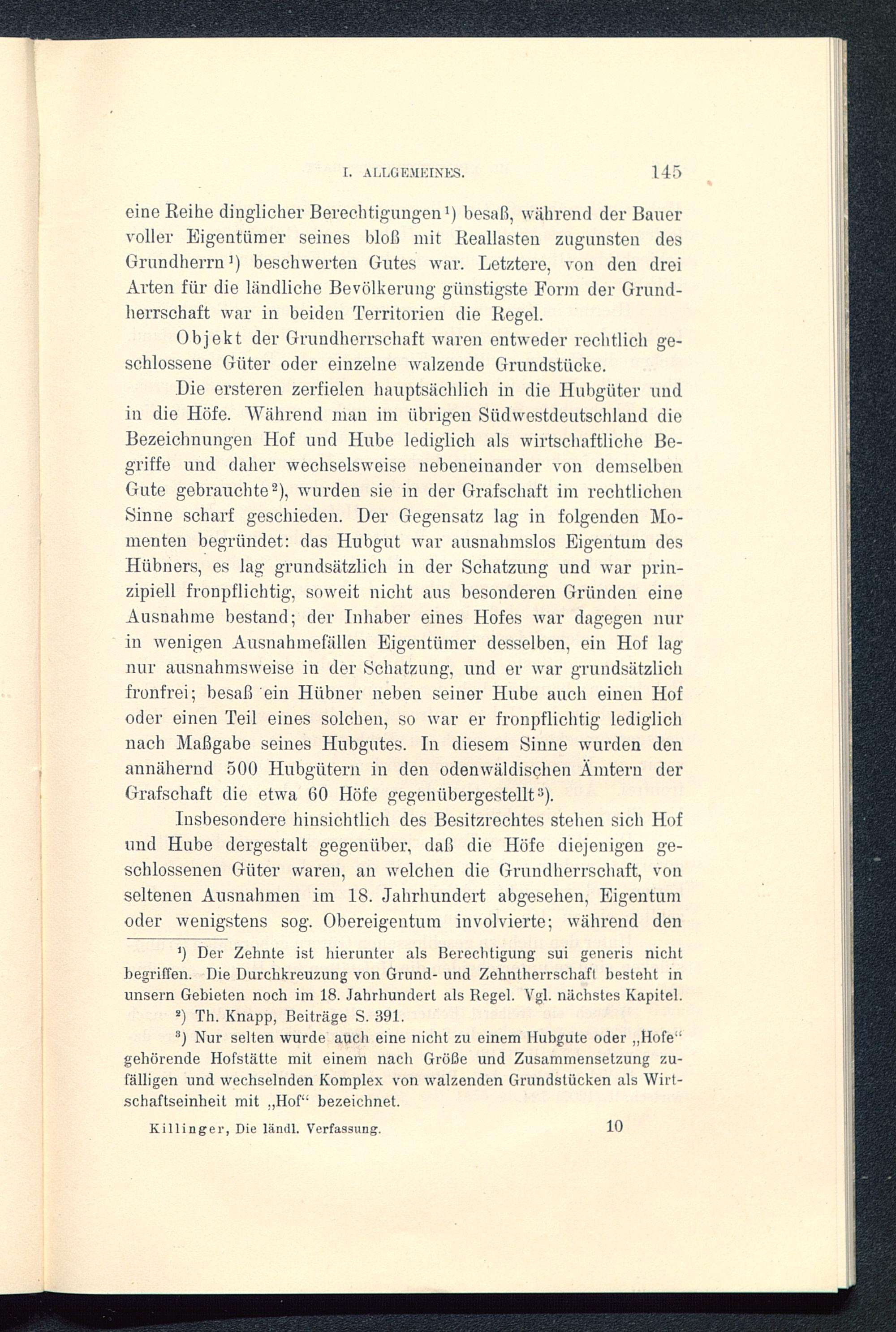 Die ersteren zerfielen hauptsächlich in die Hubgüter undin die Höfe. Während inan im übrigen Südwestdeutschland dieBezeichnungen Hof und Hube lediglich als wirtschaftliche Be-griffe und daher wechselsweise nebeneinander von demselbenGute gebrauchte 2 ), wurden sie in der Grafschaft im rechtlichenSinne scharf geschieden. Der Gegensatz lag in folgenden Mo-menten begründet: das Hubgut war ausnahmslos Eigentum desHübners, es lag grundsätzlich in der Schatzung und war prin-zipiell fronpflichtig, soweit nicht aus besonderen Gründen eineAusnahme bestand; der Inhaber eines Hofes war dagegen nurin wenigen Ausnahmefällen Eigentümer desselben, ein Hof lagnur ausnahmsweise in der Schatzung, und er war grundsätzlichfronfrei; besaß ein Hübner neben seiner Hube auch einen Hofoder einen Teil eines solchen, so war er fronpflichtig lediglichnach Maßgabe seines Hubgutes. In diesem Sinne wurden denannähernd 500 Hubgütern in den odenwäldischen Ämtern derGrafschaft die etwa 60 Höfe gegenübergestellt 3 ).
