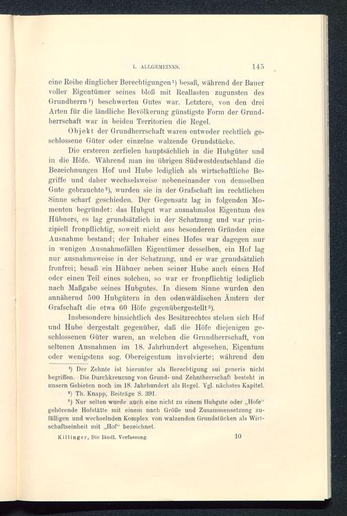 eine Reihe dinglicher Berechtigungen 1 ) besaß, während der Bauervoller Eigentümer seines bloß mit Reallasten zugunsten desGrundherrn 1 ) beschwerten Gutes war. Letztere, von den dreiArten für die ländliche Bevölkerung günstigste Form der Grund-herrschaft war in beiden Territorien die Regel.