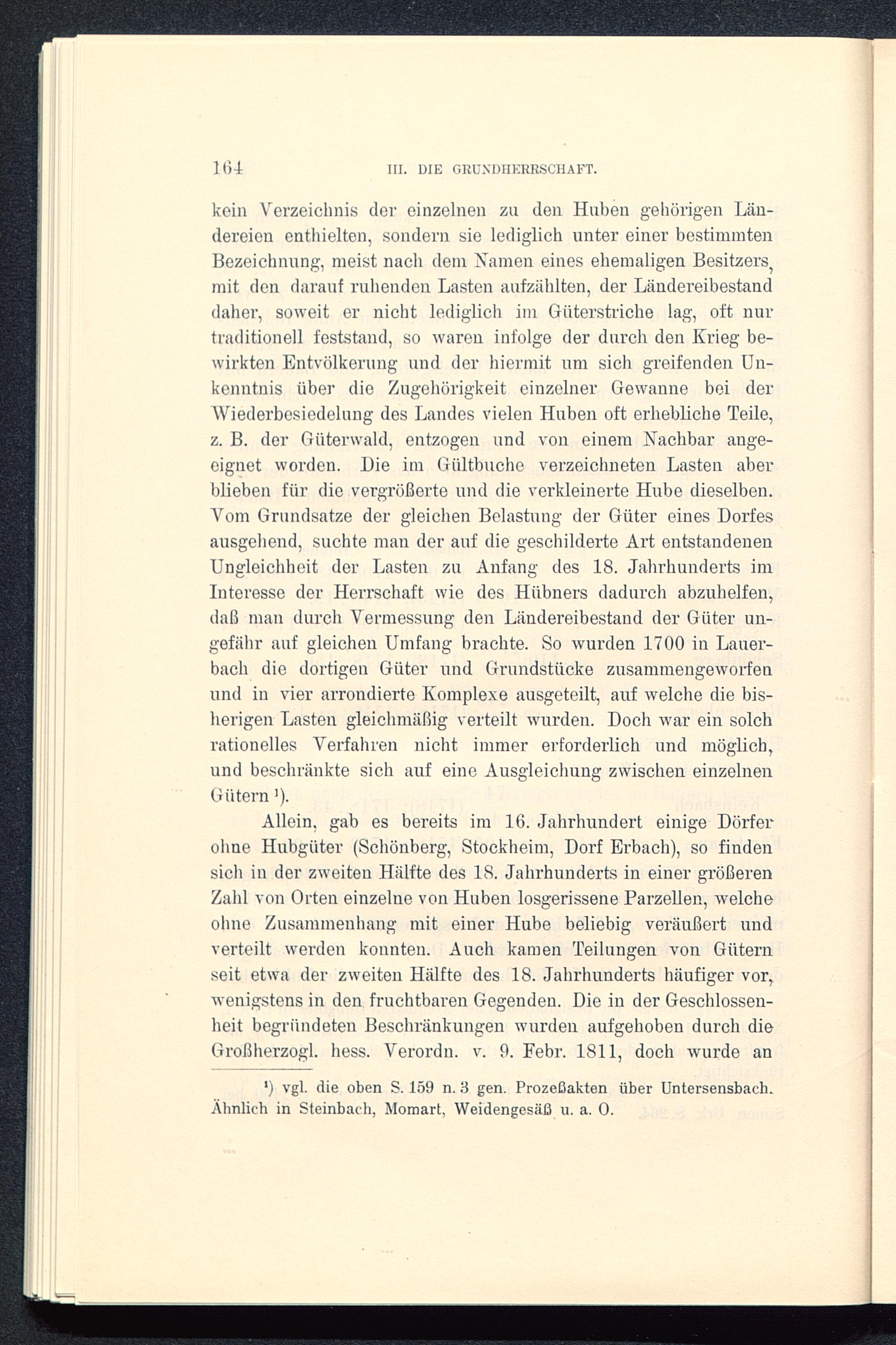 Allein, gab es bereits im 16. Jahrhundert einige Dörferohne Hubgüter (Schönberg, Stockheim, Dorf Erbach ), so findensich in der zweiten Hälfte des 18. Jahrhunderts in einer größerenZahl von Orten einzelne von Huben losgerissene Parzellen, welcheohne Zusammenhang mit einer Hube beliebig veräußert undverteilt werden konnten. Auch kamen Teilungen von Güternseit etwa der zweiten Hälfte des 18. Jahrhunderts häufiger vor,wenigstens in den fruchtbaren Gegenden. Die in der Geschlossen-heit begründeten Beschränkungen wurden aufgehoben durch dieGroßherzogi. liess. Verordn, v. 9. Febr. 1811, doch wurde an