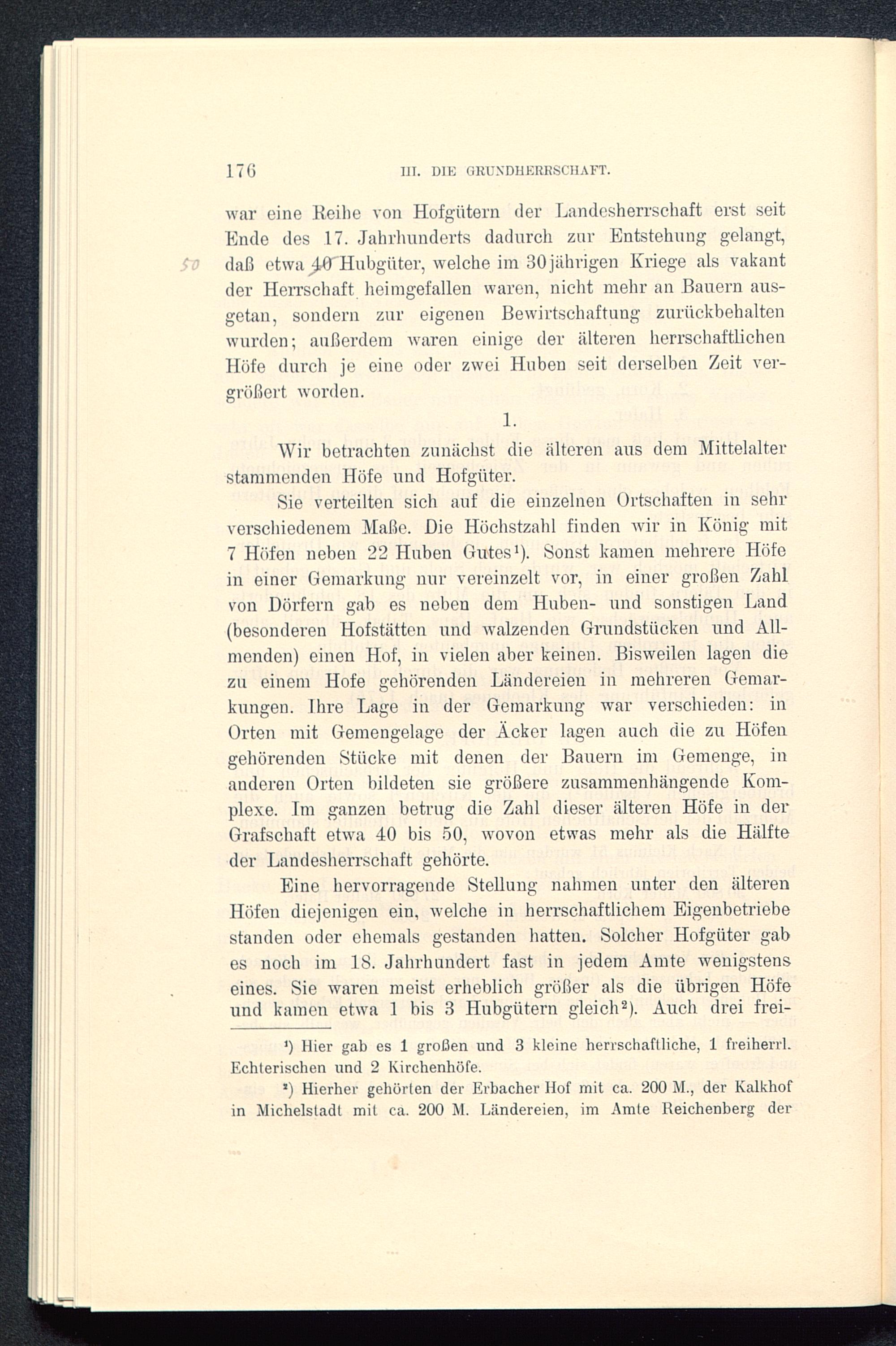 Sie verteilten sich auf die einzelnen Ortschaften in sehrverschiedenem Maße. Die Höchstzahl finden wir in König mit7 Höfen neben 22 Huben Gutes 1 ). Sonst kamen mehrere Höfein einer Gemarkung nur vereinzelt vor, in einer großen Zahlvon Dörfern gab es neben dem Huben- und sonstigen Land(besonderen Hofstätten und walzenden Grundstücken und All-menden) einen Hof, in vielen aber keinen. Bisweilen lagen diezu einem Hofe gehörenden Ländereien in mehreren Gemar-kungen. Ihre Lage in der Gemarkung war verschieden: inOrten mit Gemengelage der Äcker lagen auch die zu Höfengehörenden Stücke mit denen der Bauern im Gemenge, inanderen Orten bildeten sie größere zusammenhängende Kom-plexe. Jm ganzen betrug die Zahl dieser älteren Höfe in derGrafschaft etwa 40 bis 50, wovon etwas mehr als die Hälfteder Landesherrschaft gehörte.