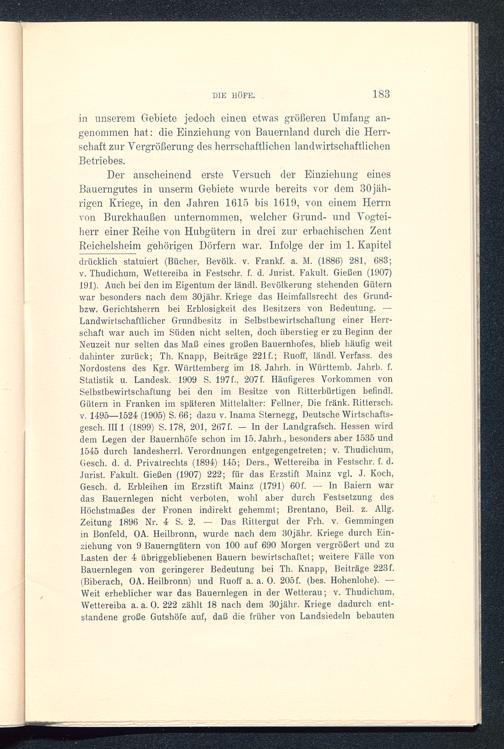 drücklich statuiert (Bücher, Bevölk. v. Frankf. a. M. (1886) 281, 683;v. Thudichum, Wettereiba in Festschr. f. d. Jurist. Fakult. Gießen (1907)191). Auch bei den im Eigentum der ländl. Bevölkerung stehenden Güternwar besonders nach dem 30jähr. Kriege das Heimfallsrecht des Grund-bzw. Gerichtsherrn bei Erblosigkeit des Besitzers von Bedeutung. —Landwirtschaftlicher Grundbesitz in Selbslbewirtschaftung einer Herr-schaft war auch im Süden nicht selten, doch überstieg er zu Beginn derNeuzeit nur selten das Maß eines großen Bauernhofes, blieb häufig weitdahinter zurück; Th. Knapp, Beiträge 221 f.; Ruoff, ländl. Verfass, desNordostens des Kgr. Württemberg im 18. Jahrh. in Württemb. Jahrb. f.Statistik u. Landesk. 1909 S. 197f., 207 f. Häufigeres Vorkommen vonSelbstbewirtschaftung bei den im Besitze von Ritterbürtigen befindl.Gütern in Franken im späteren Mittelalter: Fellner. Die fränk. Rittersch.v. 1495—1524 (1905) S. 66; dazu v. Inama Sternegg, Deutsche Wirtschafts-gesch. III1 (1899) S. 178, 201, 267 f. — In der Landgrafsch. Hessen wirddem Legen der Bauernhöfe schon im 15. Jahrh., besonders aber 1535 und1545 durch landesherrl. Verordnungen entgegengetreten; v. Thudichum ,Gesell, d. d. Privatrechts (1894) 145; Ders., Wettereiba in Festschr. f. d.Jurist. Fakult. Gießen (1907) 222; für das Erzstift Mainz vgl. J. Koch,Gesch. d. Erbleihen im Erzstift Mainz (1791) 60f. — In Baiern wardas Bauernlegen nicht verboten, wohl aber durch Festsetzung desHöchstmaßes der Fronen indirekt gehemmt; Brentano , Beil. z. Allg.Zeitung 1896 Nr. 4 S. 2. — Das Rittergut der Frh. v. Gemmingen in Bonfeld , OA. Heilbronn, wurde nach dem BOjähr. Kriege durch Ein-ziehung von 9 Bauerngütern von 100 auf 690 Morgen vergrößert und zuLasten der 4 übriggebliebenen Bauern bewirtschaftet; weitere Fälle vonBauernlegen von geringerer Bedeutung bei Th. Knapp, Beiträge 223 f.(Biberach, OA. Heilbronn) und Ruoff a. a. 0. 205f. (bes. Hohenlohe ). —Weit erheblicher war das Bauernlegen in der Wetterau; v. Thudichum,Wettereiba a. a. 0. 222 zählt 18 nach dem 30jähr. Kriege dadurch ent-standene große Gutshöfe auf, daß die früher von Landsiedeln bebauten