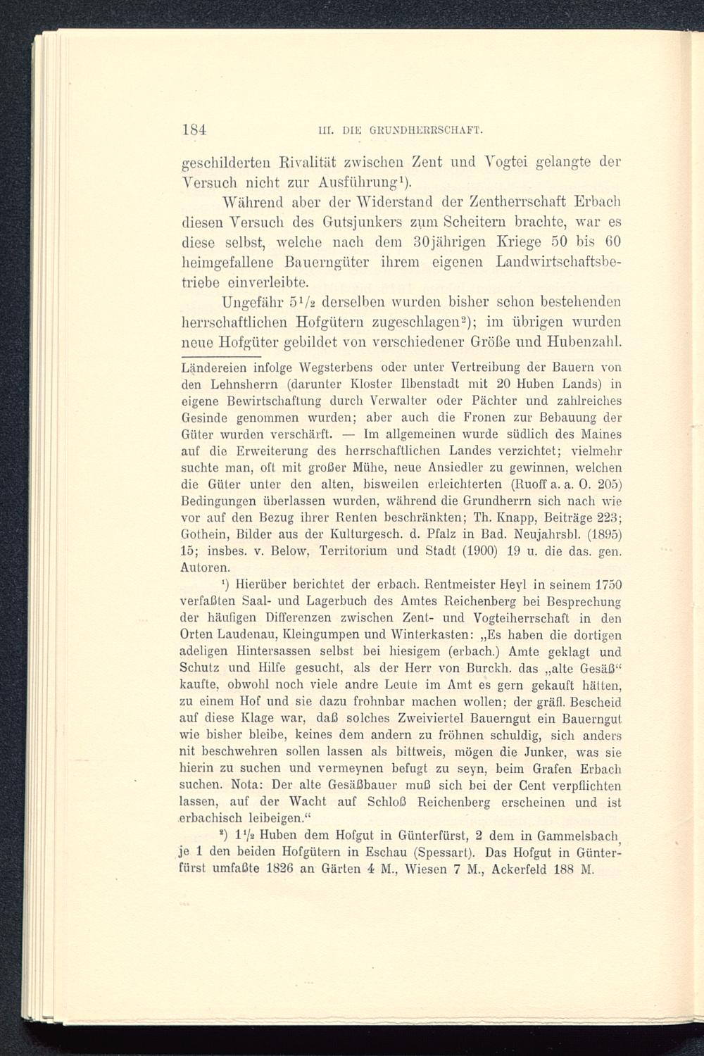 *) l 1 / 2 Huben dem Hofgut in Günterfürst, 2 dem in Gammelsbach je 1 den beiden Hofgütern in Eschau (Spessart) . Das Hofgut in Günter-fürst umfaßte 1826 an Gärten 4 M., Wiesen 7 M., Ackerfeld 188 M.