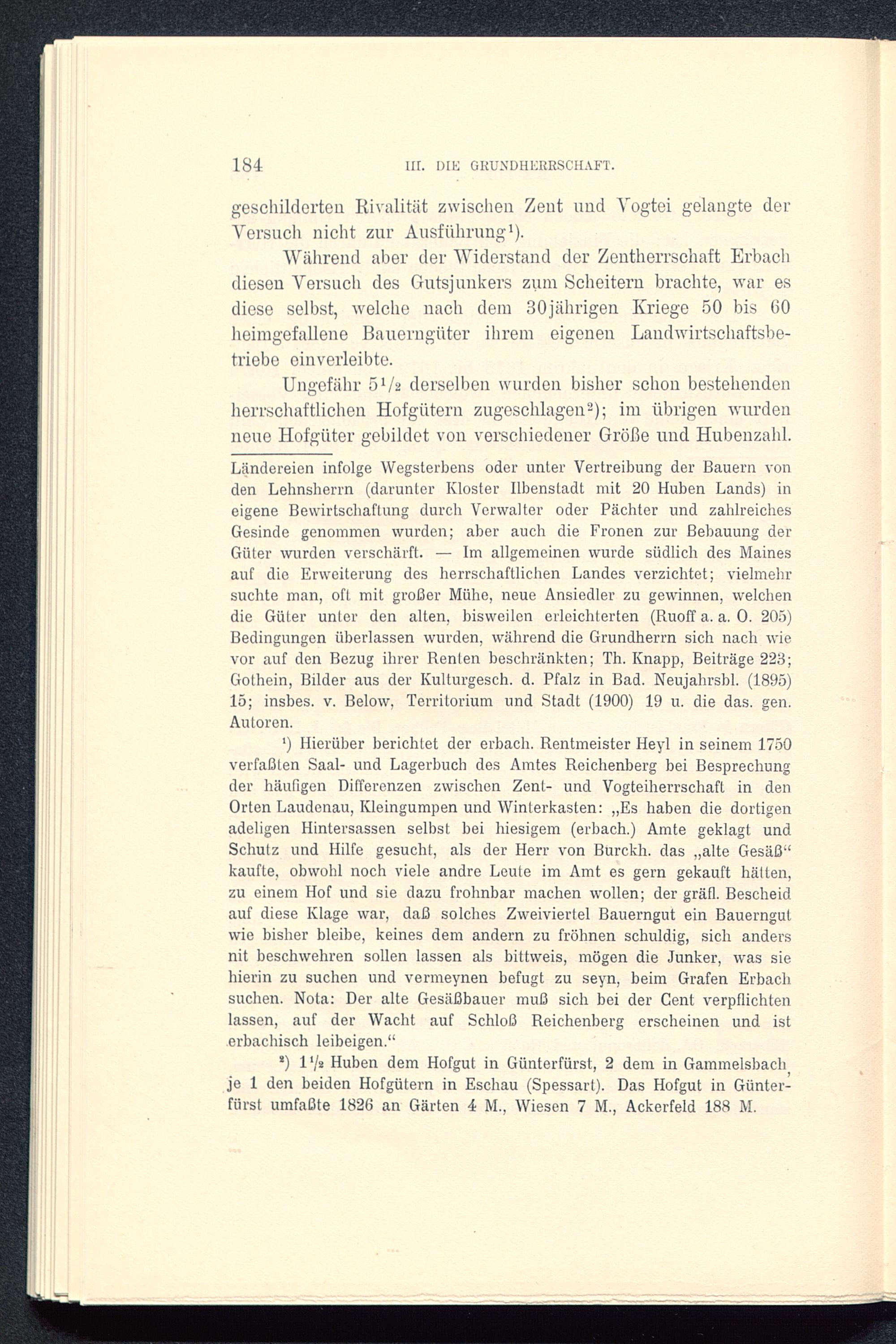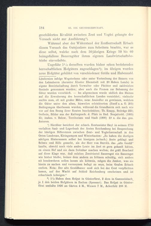 Während aber der Widerstand der Zentherrschaft Erbachdiesen Versuch des Gutsjunkers zum Scheitern brachte, war esdiese selbst, welche nach dem 30jährigen Kriege 50 bis 60heimgefallene Bauerngüter ihrem eigenen Landwirtschaftsbe-triebe einverleibte.