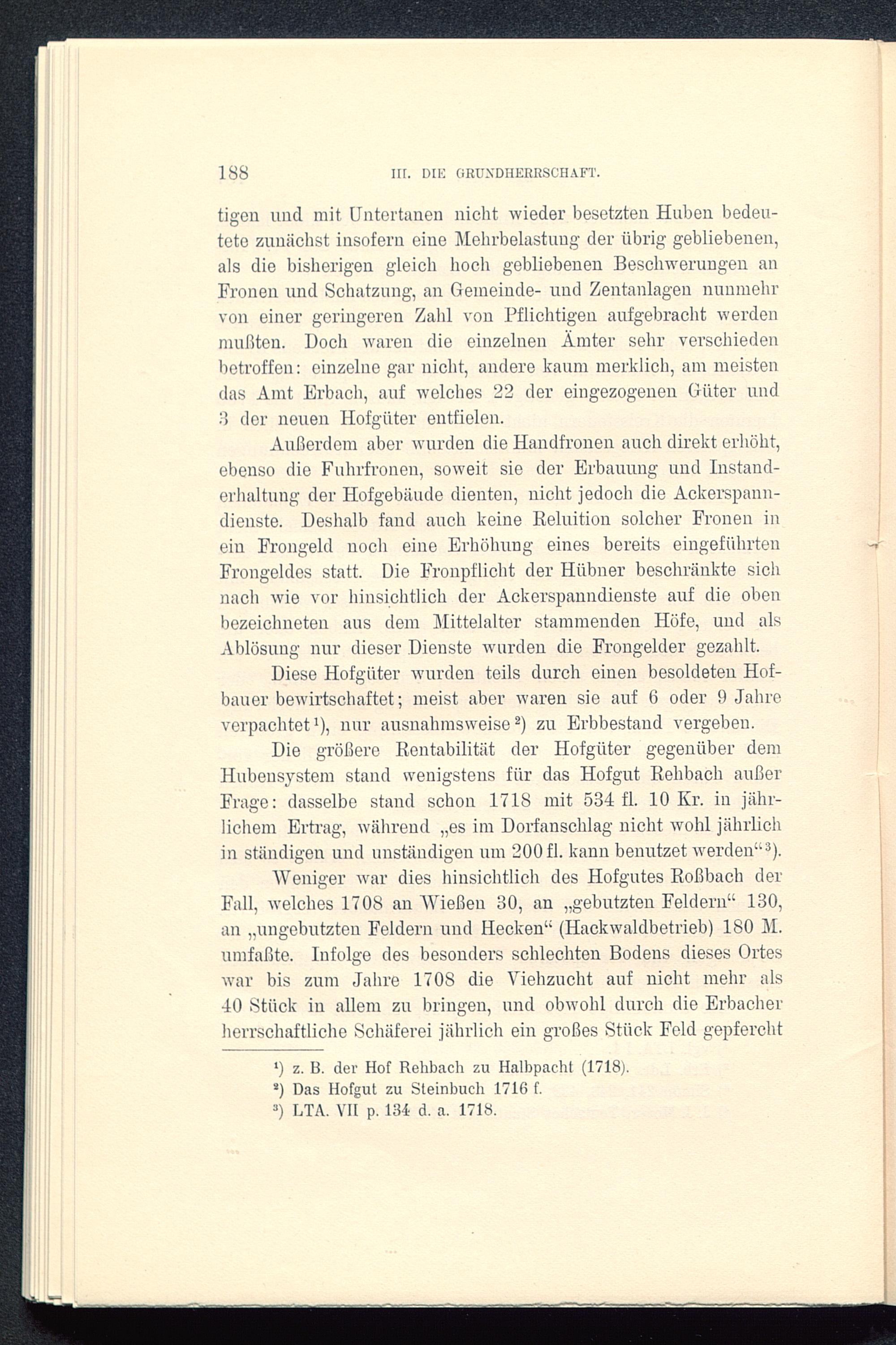 Die größere Rentabilität der Hofgüter gegenüber demHubensystem stand wenigstens für das Hofgut Rehbach außerFrage: dasselbe stand schon 1718 mit 534 fl. 10 Kr. in jähr-lichem Ertrag, während „es im Dorfanschlag nicht wohl jährlichin ständigen und unständigen um 200 fl. kann benutzet werden“ 3 ).