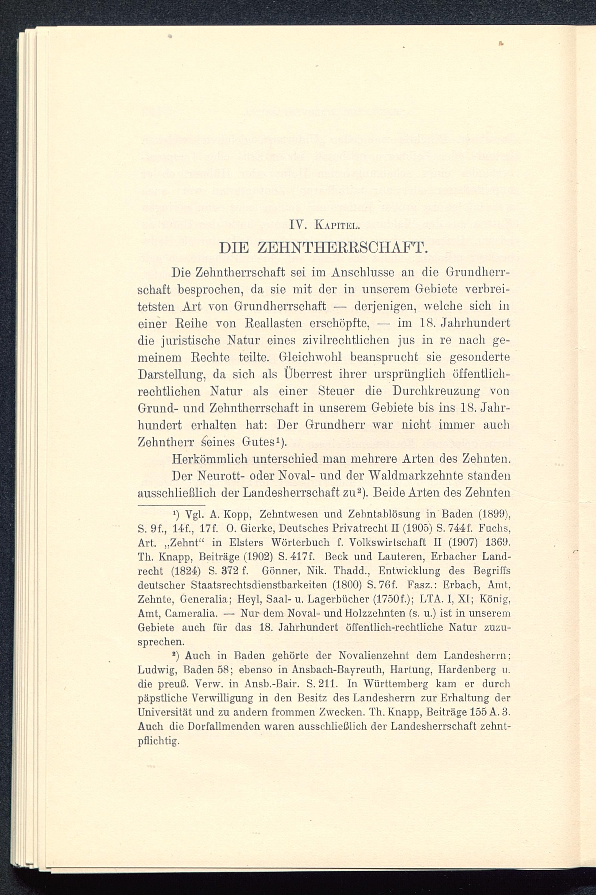 Die Zehntherrschaft sei im Anschlüsse an die Grundherr-schaft besprochen, da sie mit der in unserem Gebiete verbrei-tetsten Art von Grundherrschaft — derjenigen, welche sich ineiner Reihe von Reallasten erschöpfte, — im 18. Jahrhundertdie juristische Natur eines zivilrechtlichen jus in re nach ge-meinem Rechte teilte. Gleichwohl beansprucht sie gesonderteDarstellung, da sich als Überrest ihrer ursprünglich öffentlich-rechtlichen Natur als einer Steuer die Durchkreuzung vonGrund- und Zehntherrschaft in unserem Gebiete bis ins 18. Jahr-hundert erhalten hat: Der Grundherr war nicht immer auchZehntherr deines Gutes 1 ).