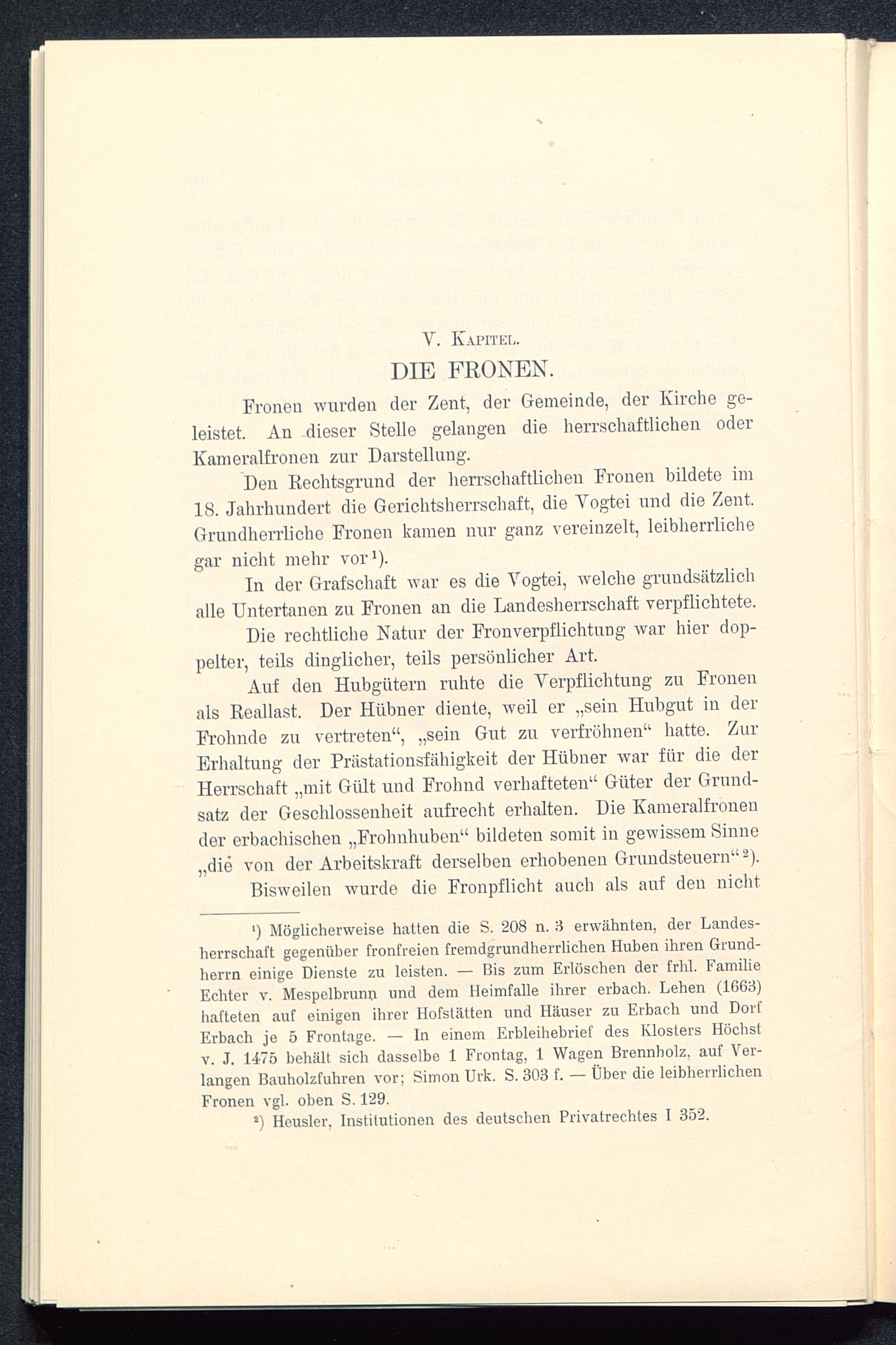 *) Möglicherweise hatten die S. 208 n. 3 erwähnten, der Landes-herrschaft gegenüber fronfreien fremdgrundherrlichen Huben ihren Grund-herrn einige Dienste zu leisten. — Bis zum Erlöschen der frhl. FamilieEchter v. Mespelbrunn und dem Heimfalle ihrer erbach. Lehen (1663)hafteten auf einigen ihrer Hofstätten und Häuser zu Erbach und DorfErbach je 5 Frontage. — In einem Erbleihebrief des Klosters Höchstv. J. 1475 behält sich dasselbe 1 Frontag, 1 Wagen Brennholz, auf Ver-langen Bauholzfuhren vor; Simon Urk. S. 303 f. — Über die leibherrlichenFronen vgl. oben S. 129.