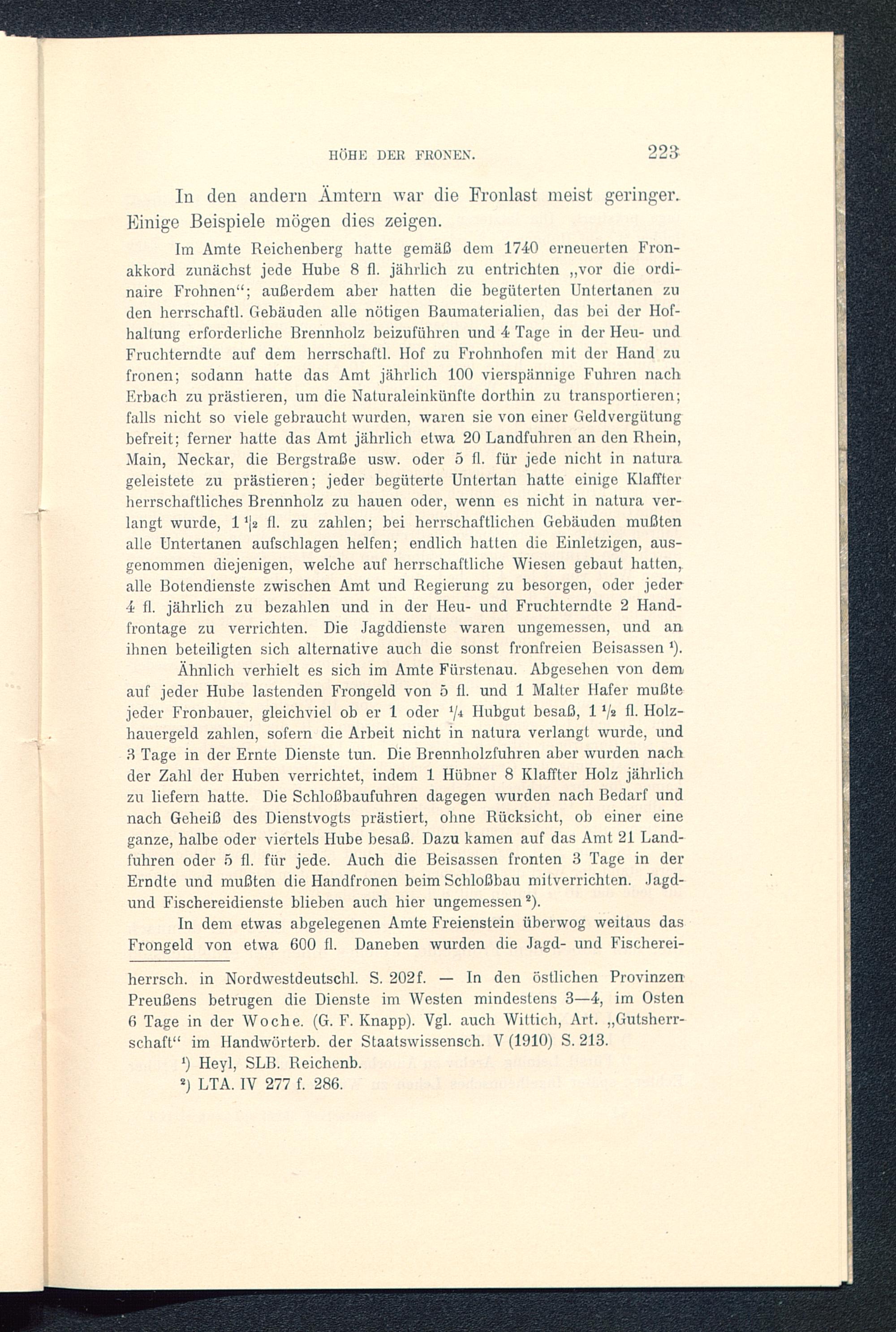 Im Amte Reichenberg hatte gemäß dem 1740 erneuerten Fron-akkord zunächst jede Hube 8 fl. jährlich zu entrichten „vor die ordi-naire Frohnen“; außerdem aber hatten die begüterten Untertanen zuden herrschaftl. Gebäuden alle nötigen Baumaterialien, das bei der Hof-haltung erforderliche Brennholz beizuführen und 4 Tage in der Heu- undFruchterndte auf dem herrschaftl. Hof zu Frohnhofen mit der Hand zufronen; sodann hatte das Amt jährlich 100 vierspännige Fuhren nachErbach zu prästieren, um die Naturaleinkünfte dorthin zu transportieren;falls nicht so viele gebraucht wurden, waren sie von einer Geldvergütungbefreit; ferner hatte das Amt jährlich etwa 20 Landfuhren an den Rhein ,Main, Neckar, die Bergstraße usw. oder 5 11. für jede nicht in naturageleistete zu prästieren; jeder begüterte Untertan hatte einige Klaffterherrschaftliches Brennholz zu hauen oder, wenn es nicht in natura ver-langt wurde, 1 ‘[2 fl. zu zahlen; bei herrschaftlichen Gebäuden mußtenalle Untertanen aufschlagen helfen; endlich hatten die Einletzigen, aus-genommen diejenigen, welche auf herrschaftliche Wiesen gebaut hatten,alle Botendienste zwischen Amt und Regierung zu besorgen, oder jeder4 fl. jährlich zu bezahlen und in der Heu- und Fruchterndte 2 Hand-frontage zu verrichten. Die Jagddienste waren ungemessen, und anihnen beteiligten sich alternative auch die sonst fronfreien Beisassen ').