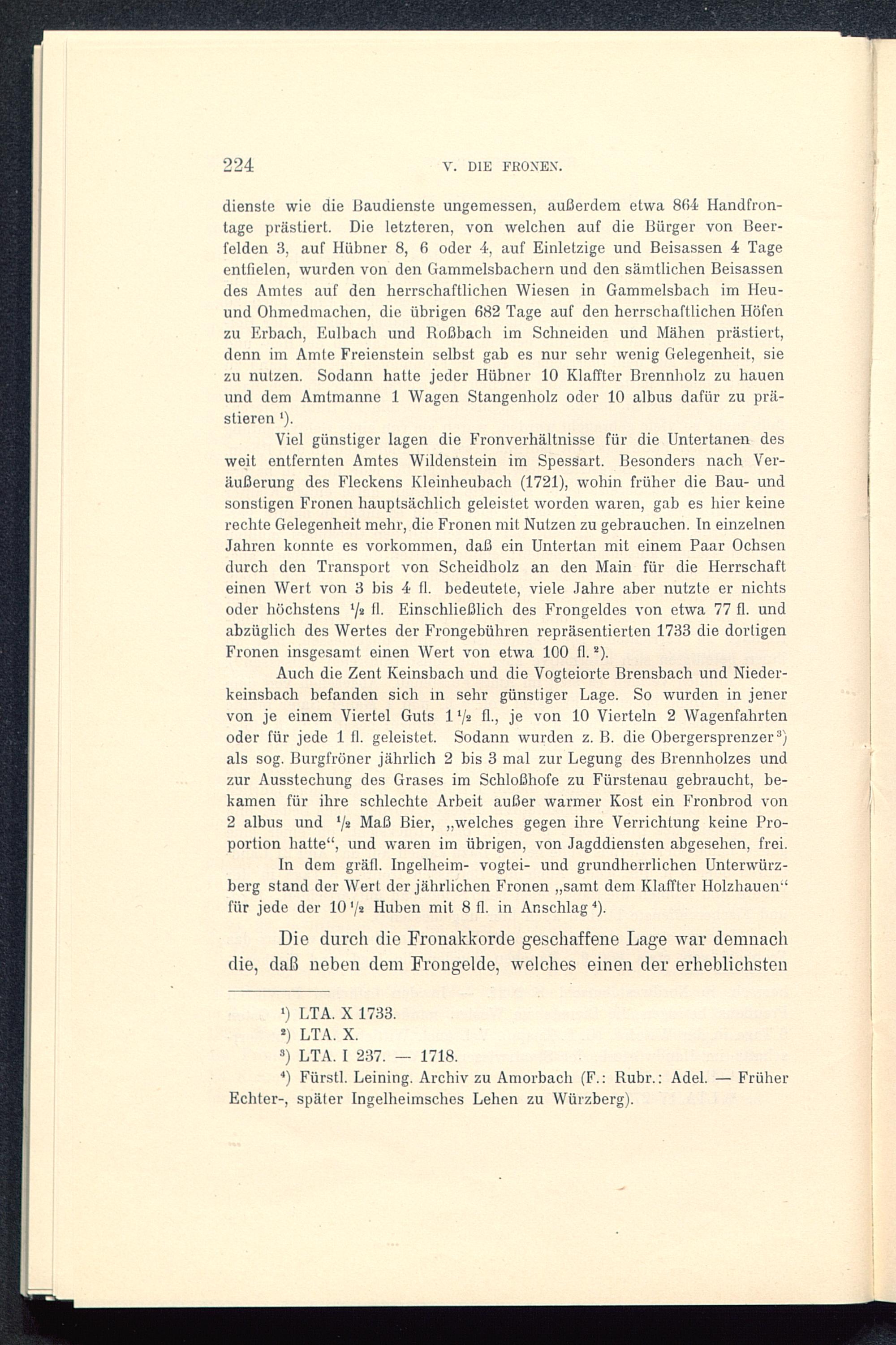 Viel günstiger lagen die Fronverhältnisse für die Untertanen desweit entfernten Amtes Wildenstein im Spessart . Besonders nach Ver-äußerung des Fleckens Kleinheubach (1721), wohin früher die Bau- undsonstigen Fronen hauptsächlich geleistet worden waren, gab es hier keinerechte Gelegenheit mehr, die Fronen mit Nutzen zu gebrauchen. In einzelnenJahren konnte es Vorkommen, daß ein Untertan mit einem Paar Ochsendurch den Transport von Scheidholz an den Main für die Herrschafteinen Wert von 3 bis 4 fl. bedeutete, viele Jahre aber nutzte er nichtsoder höchstens ‘/a fl. Einschließlich des Frongeldes von etwa 77 fl. undabzüglich des Wertes der Frongebühren repräsentierten 1733 die dortigenFronen insgesamt einen Wert von etwa 100 fl. 2 ).
