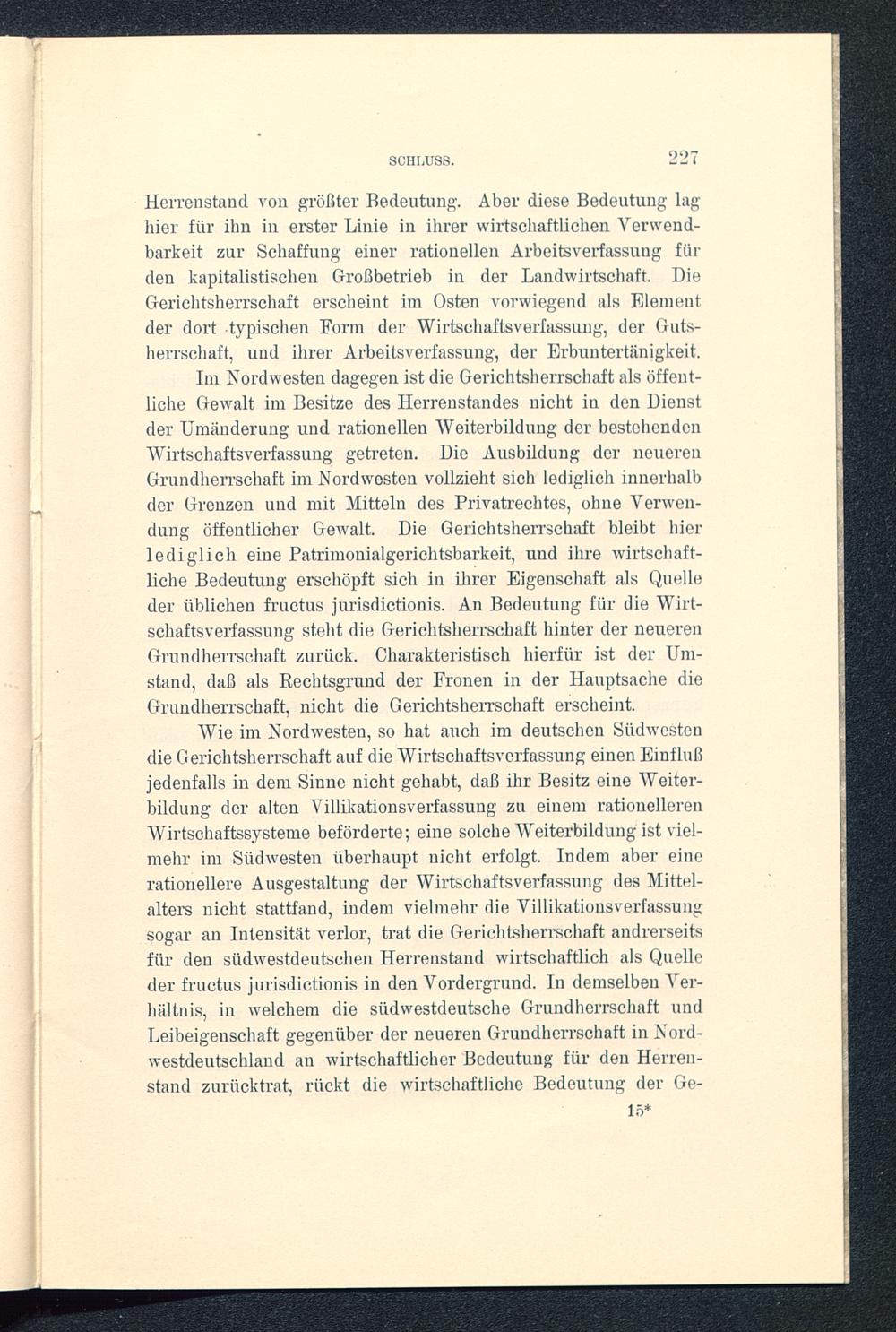 Wie im Nordwesten, so hat auch im deutschen Südwestendie Gerichtsherrschaft auf die Wirtschaftsverfassung einen Einflußjedenfalls in dem Sinne nicht gehabt, daß ihr Besitz eine Weiter-bildung der alten Villikationsverfassung zu einem rationellerenWirtschaftssysteme beförderte; eine solche Weiterbildung ist viel-mehr im Südwesten überhaupt nicht erfolgt. Indem aber einerationellere Ausgestaltung der Wirtschafts Verfassung des Mittel-alters nicht stattfand, indem vielmehr die Villikationsverfassungsogar an Intensität verlor, trat die Gerichtsherrschaft andrerseitsfür den südwestdeutschen Herrenstand wirtschaftlich als Quelleder fructus jurisdictionis in den Vordergrund. In demselben Ver-hältnis, in welchem die südwestdeutsche Grundherrschaft undLeibeigenschaft gegenüber der neueren Grundherrschaft in Nord-westdeutschland an wirtschaftlicher Bedeutung für den Herren-stand zurücktrat, rückt die wirtschaftliche Bedeutung der Ge-