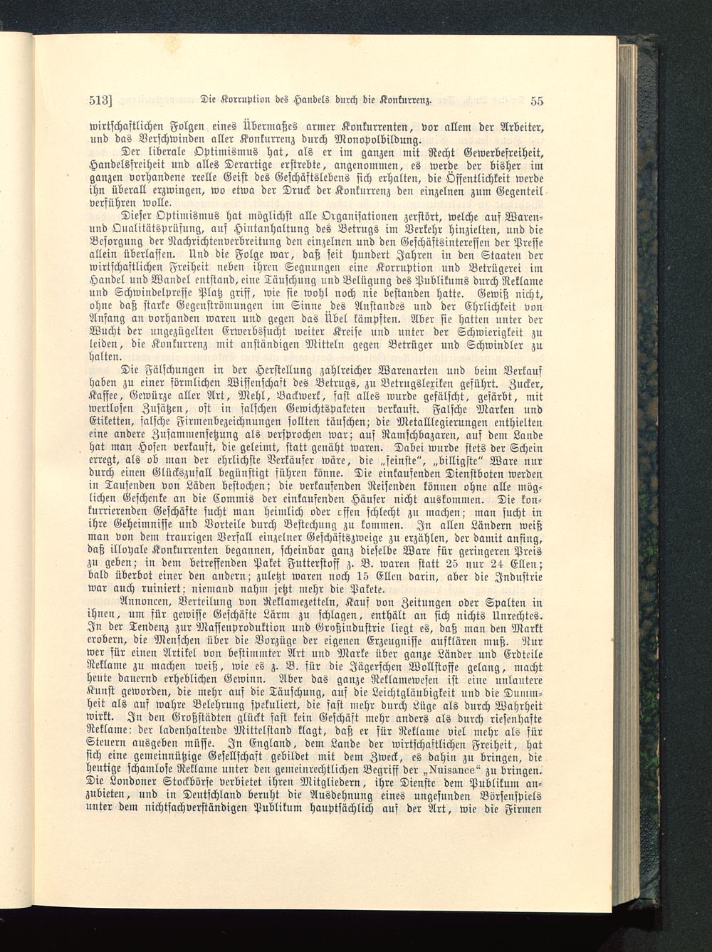 Der liberale Optimismus hat, als er im ganzen mit Recht Gewerbefreiheit,Handelsfreiheit und alles Derartige erstrebte, angenommen, es werde der bisher imganzen vorhandene reelle Geist des Geschästslcbens sich erhalten, die Öffentlichkeit werdeihn überall erzwingen, wo etwa der Druck der Konkurrenz den einzelnen zum Gegenteilverführen wolle.